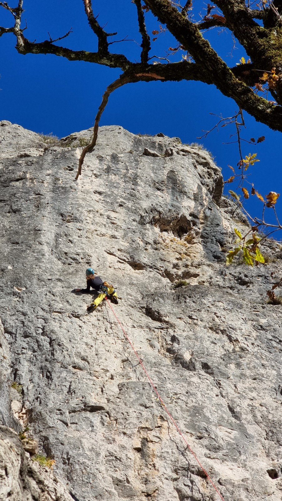 Moving rightwards from the “Mur a Cinq” there’s a tall wall with two routes which share a common start. Here’s Coralise on the left line – 7a+/b (the right one is 6b+)