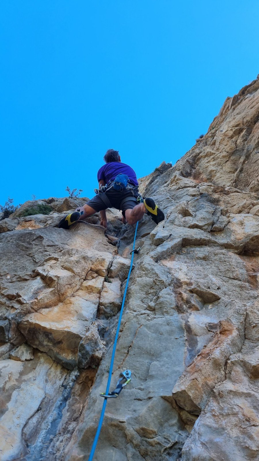 Perhaps the pick of the crag looked to be the steep arete of Sombrana, 7a, and there was a young Brit team doing battle with it as we arrived – clearly no pushover. I was surprised to just about get the bottom 3m, but then stopped short by a big rock over onto a ledge and the subsequent roll-over move around the arete was completely baffling. Tough indeed!