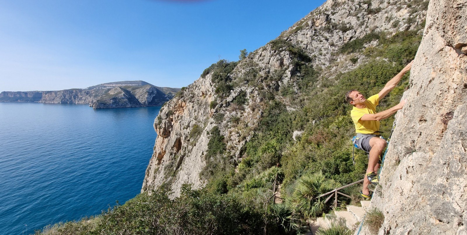 The clifftops around the spectacular Cap de la Nau, beyond Xabia, are crammed with holiday properties, seemingly stuck on at random anywhere there’s a bit of non-vertical space – like decorations on a kid’s dream of a birthday cake. Some of these are utilitarian shoeboxes, but there are some seriously swanky pads – few more swanky than those around Torre Ambolo. You can only imagine their NIMBY bewilderment when local activists equipped a dozen sectors for climbing on the cliffs below, presumably with the support of the local officialdom as they’ve even erected a billboard with a comprehensive topo in the parking area.