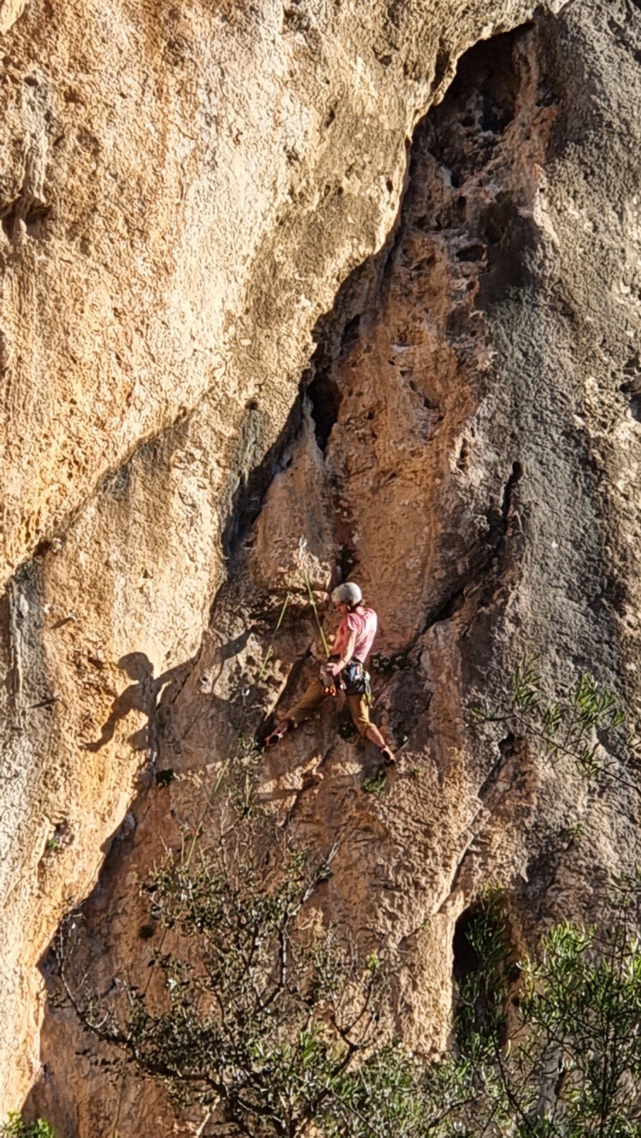 Nicely warmed up (despite Helen heroically belaying in an puffy jacket) it’s time for a grapple with something trickier. Maulets a la Lluita, 7a, as a towering line of fiercely overhanging raggedy pockets and cracks – after a monumental battle I pull up at a tricky clip just short of a no-hands rest beneath the chains; disappointment somewhat offset by the UKC concensus grade of hard 7a+