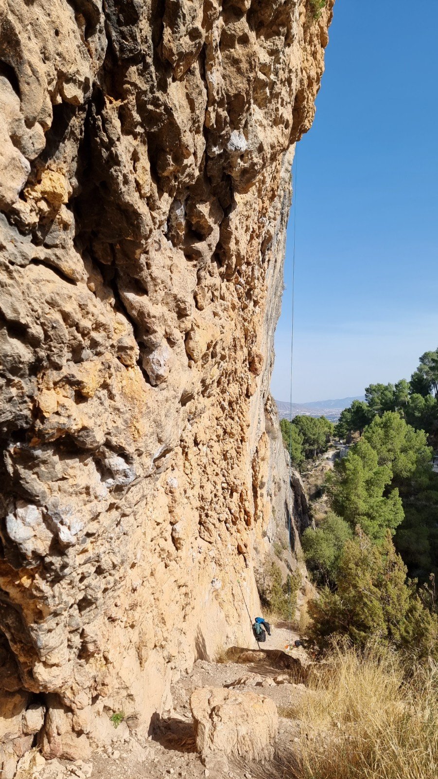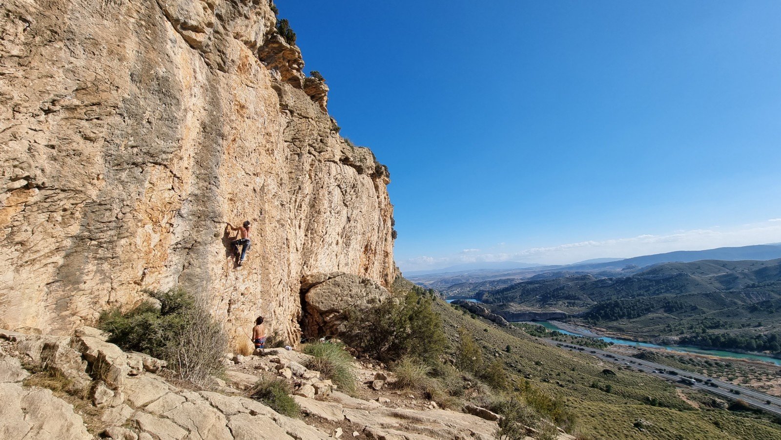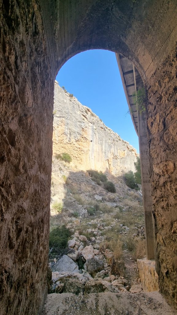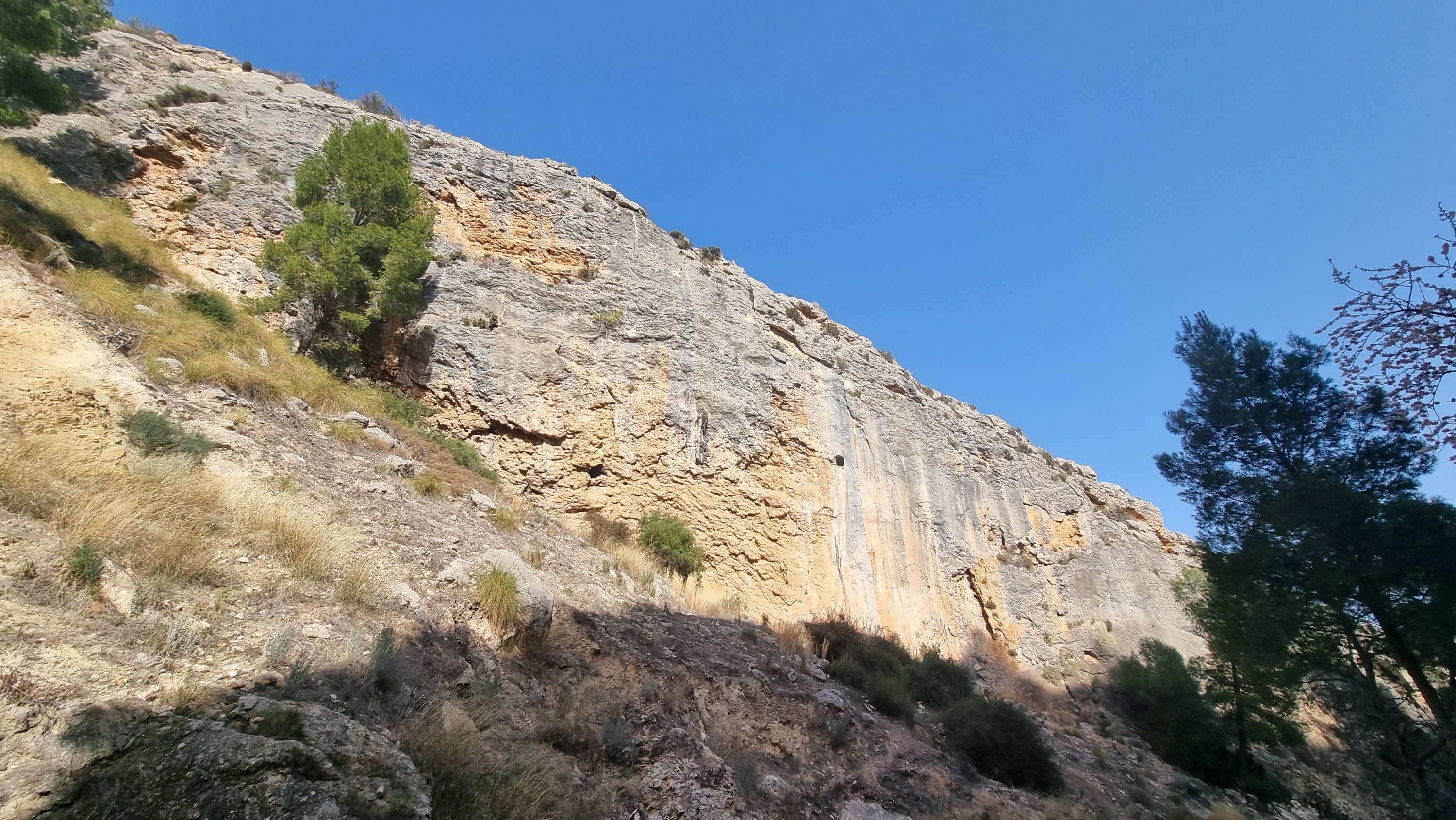 Not far from Mula is the pretty, partly fortified town of Cieza. We’d visited Sector Atalaya near the town a few years ago https://rockaroundtheworld.co.uk/2018/01/20/atalaya-cieza/ so decided to check out El Puente. Whilst both are referred to as Cieza, they’re about 20mins apart, with El Puente tucked out of sight in the almond-blossom filled hinterland west of town. Its south-east aspect should be perfect for a hot day, but unfortunately it’s in a ravine which makes for shady belay conditions on the lower part of the crag.