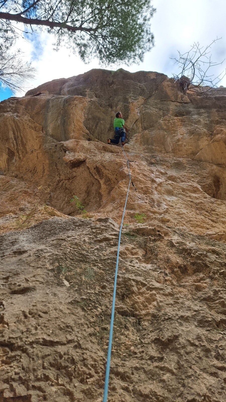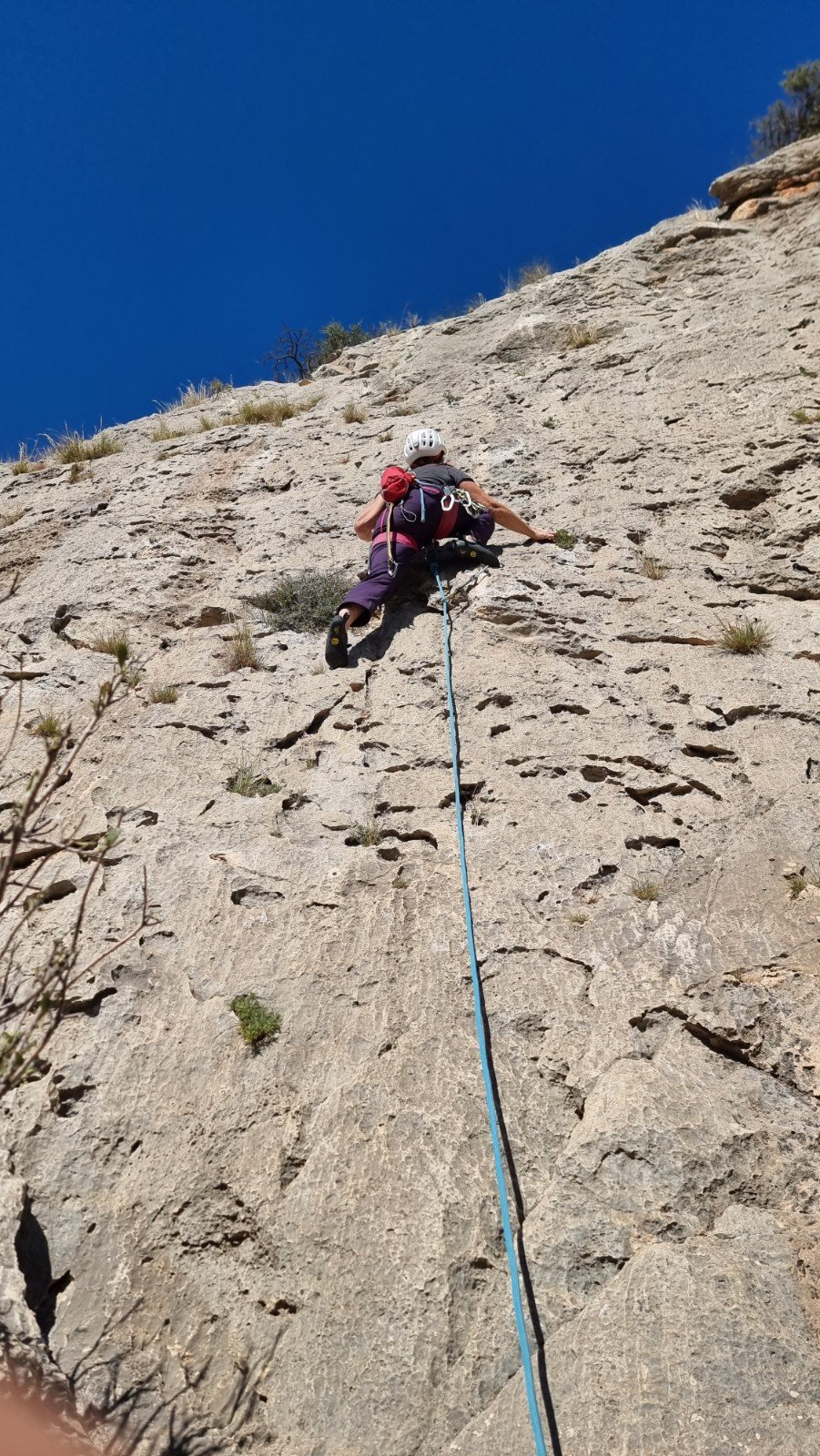 We were adopted by a couple of locals and when I explained that I only had time for a couple of routes they kindly determined my itinerary. I should warm up on Guilt 6b+ (tough – a bit polished on white, crimpy rock – reminiscent of Peak Limestone) then drop down to the pinnacle and try Un Higo Testigo, 7a. This had the appeal of being predominantly a crack line, but the disadvantage of being a stupendously steep one! Here’s me pausing for breath as the crack steepens and I just about managed to cling on for the onsight, much to our new friends’ approval.