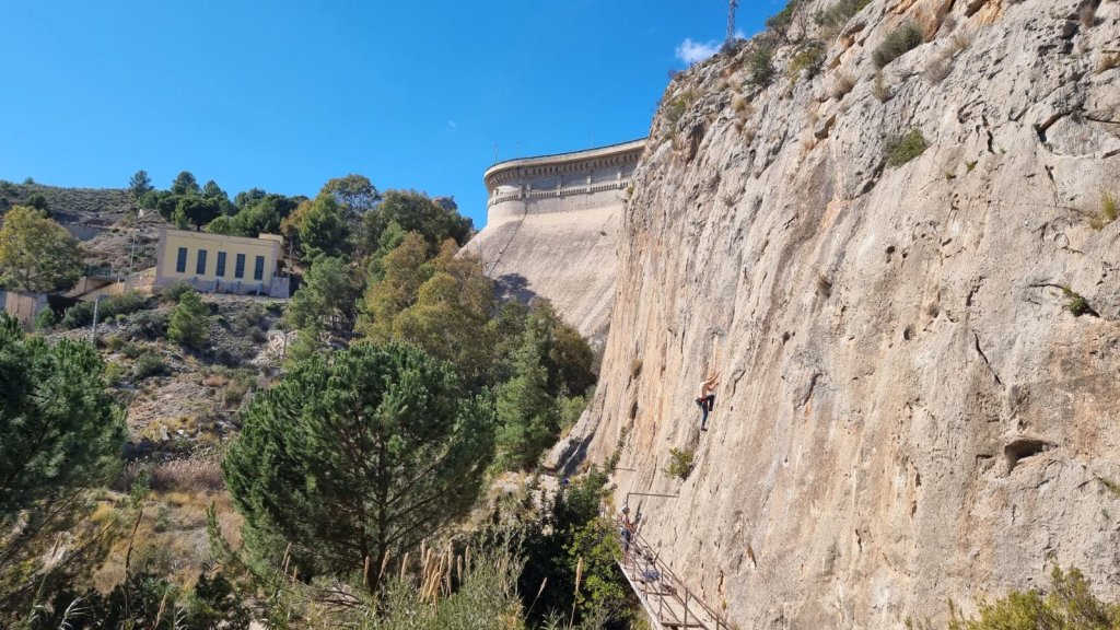 Time to head for the shade – Passilo is covered in the Levante Sud book as well as Donde Escalar. We were slightly confused where to park, as there are conflicting road signs that suggest that you can’t walk or drive across the dam, yet the parking is at a very attractive picnic area just over the dam, in the middle of the “no go” area. We decided “when in Mula” and ignored the signs as the locals were doing. You get a great view of the crag from the dam: