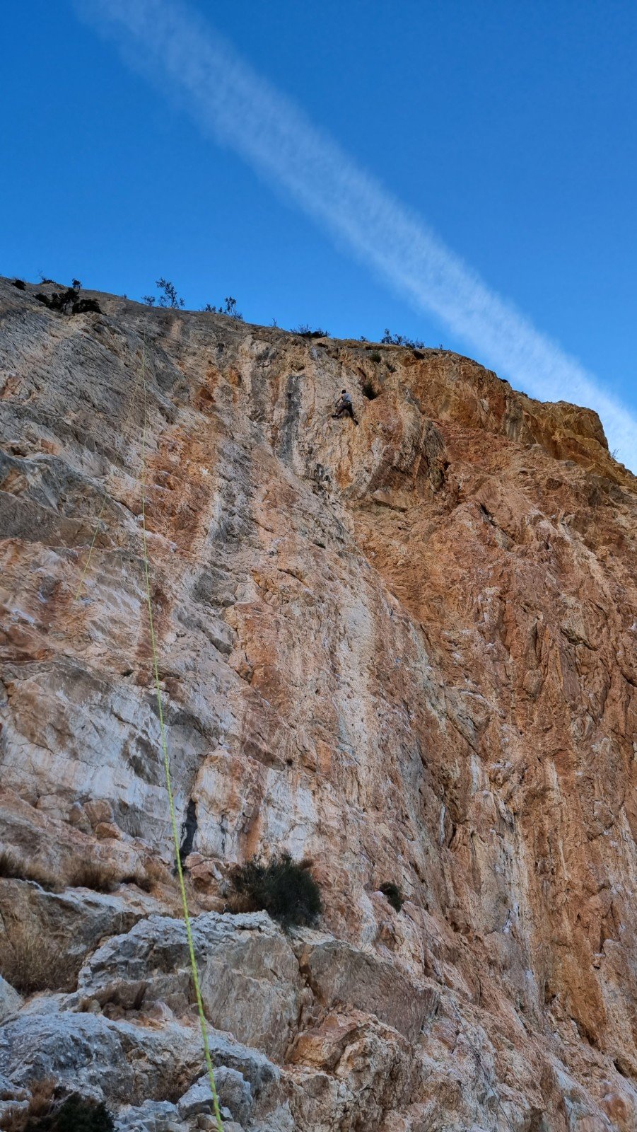 Anyway, the developed area is plenty intimidating enough – a central orange wall is home to a couple of dozen 30-40m 7s and 8s, and unusually is flanked by a few quality easier routes. It’s an obvious venue for another scorchio day in the mid 20s, and the locals are out in force; the only other non-Spanish climbers are Phil and Ali, who know a thing or two about picking a good crag. Great to bump into them having last caught up about 50km away but almost 2 years ago (apart from a chance encounter at Llanymynech between Lockdowns).
