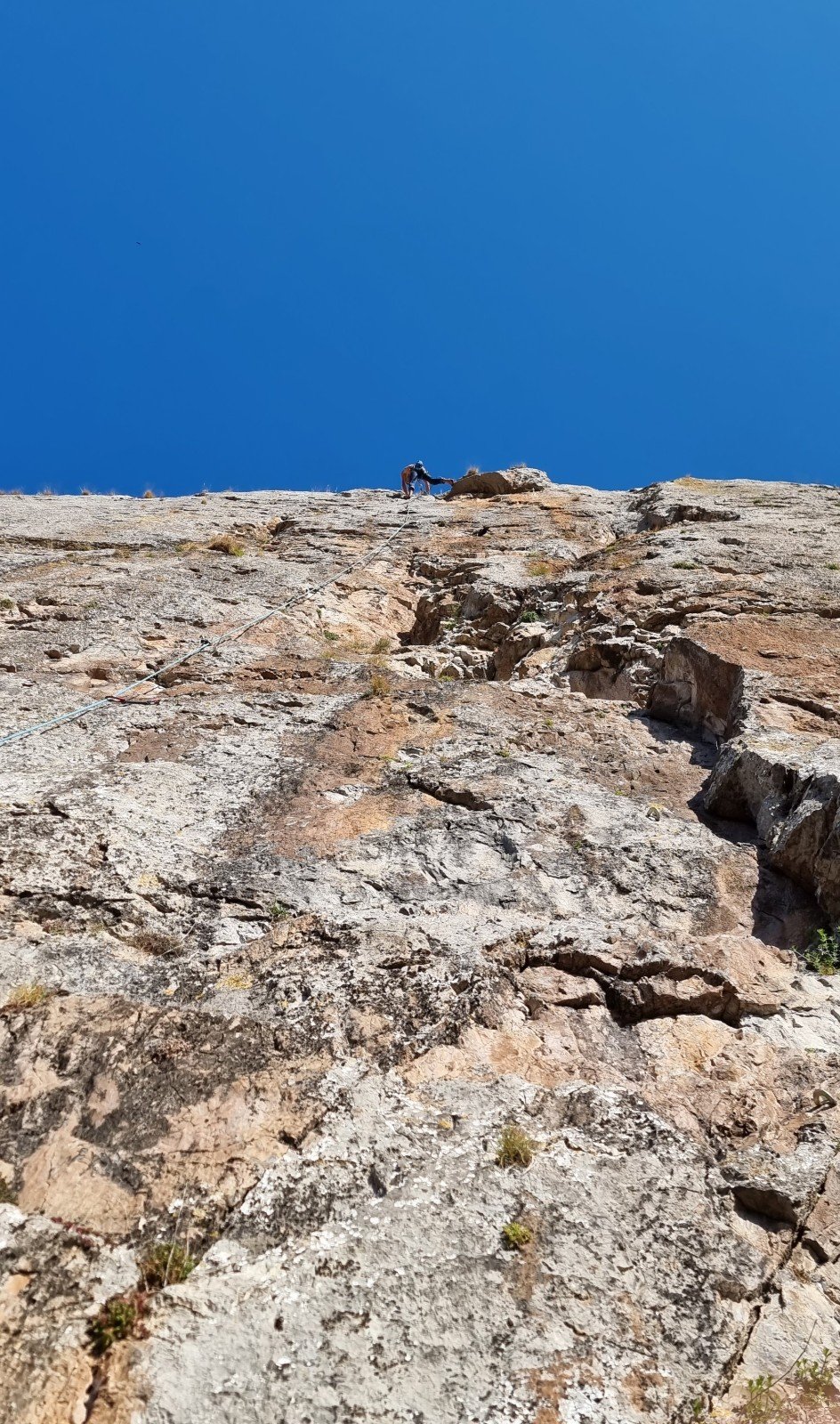 It’s a huge pitch, a good 30m+, and it’s certainly guapa (beautiful) and stiffens up considerably after it splits out left for the last few bolts and heads for the left of the obvious small roof. It’s just shy of vertical, so you have plenty of time to contemplate the “no holds” at the crux before concocting a sequence out of what little there is – happily my recipe worked.