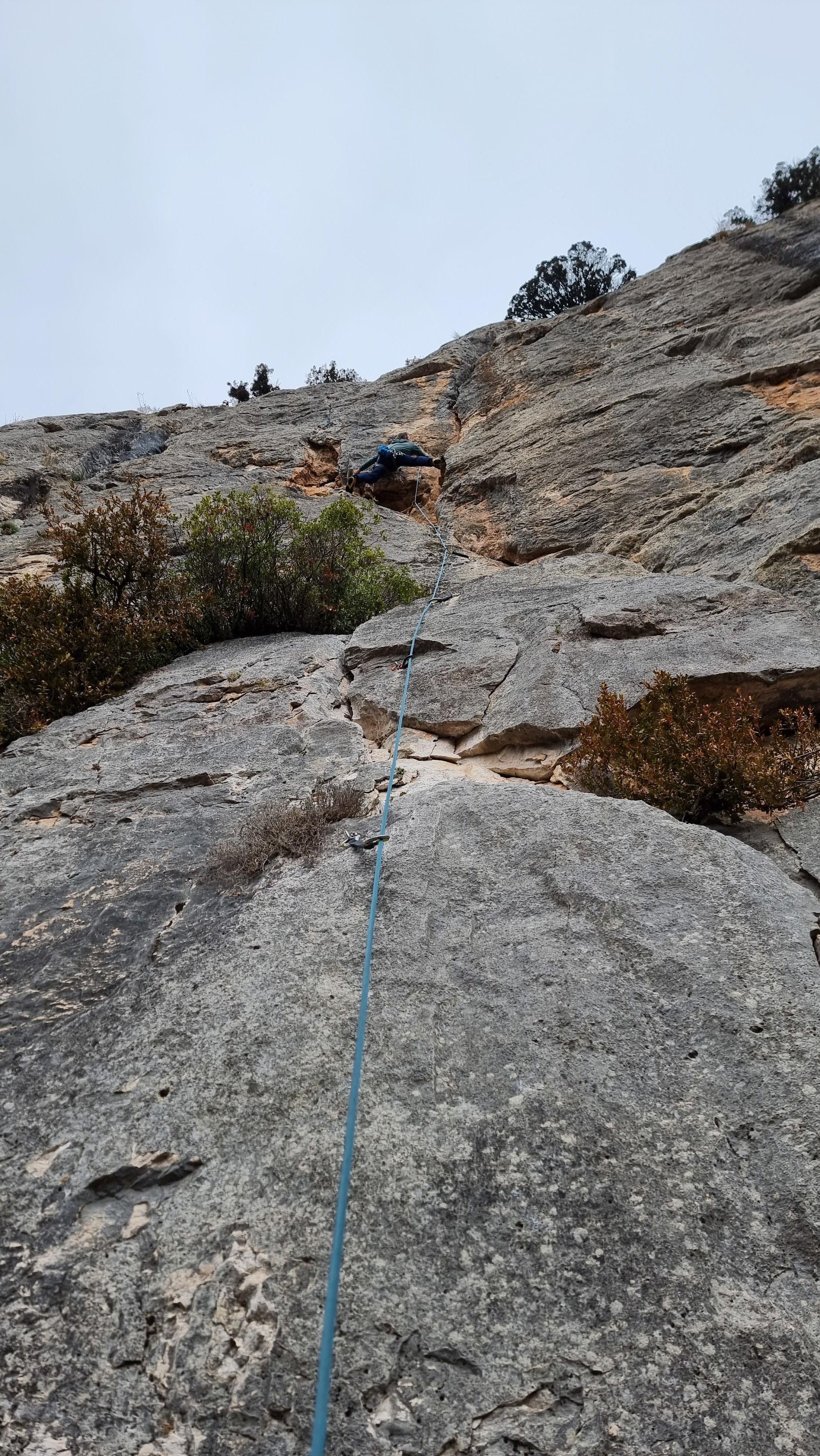 This was a “new to us” crag, even though it appeared in the first edition of Lleida Climbs. I guess the reason we hadn’t visited previously is because its sweet spot is 6c to 7b, with only a solitary route below 6b+. Happily, Helen was keen for a rest day but happy to be a “belay bunny”. Unhappily, the gloomy weather that we’d been successfully dodging for the previous 4 days had finally arrived with a vengeance.