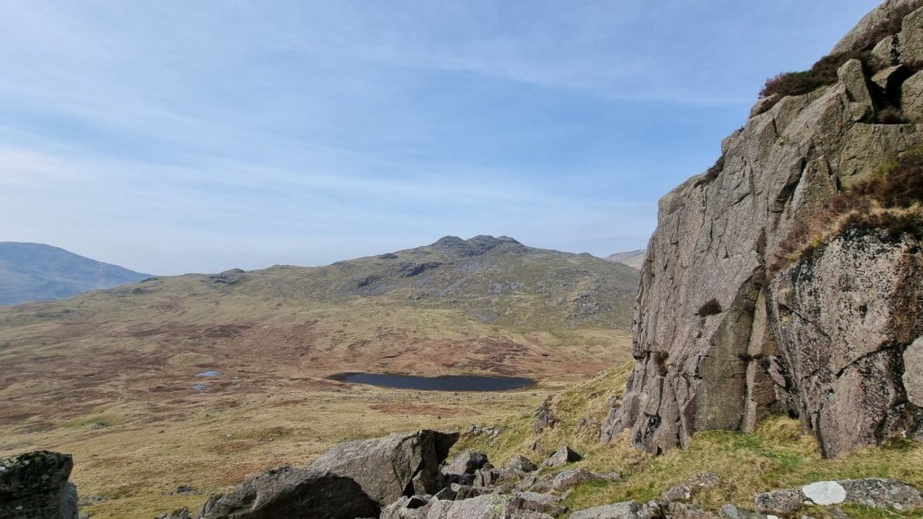 After a bit of a Covid-enforced lull in RockAroundTheWorld activity, Sunday was an opportunity for some gentle trad in the company of Stan (also recovering, though a bit further down the line). Coolish, and with hazy sunshine, the strong breeze was the deciding factor in staying off the big mountain routes, but Pike o’ Blisco offered the prospect of Lakeland rock and scenery without the long walk-in (and a decent chance of finding a parking spot on Easter Bank Holiday weekend!). I’d been enchanted on a first visit to Black Crag last year, but that left Lightning Crag and Long Scar as new territory to explore.