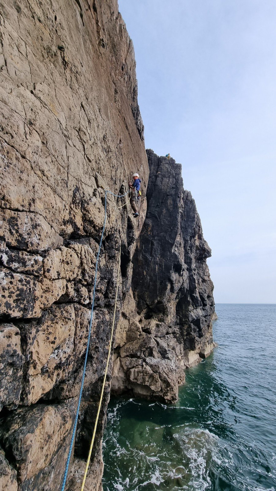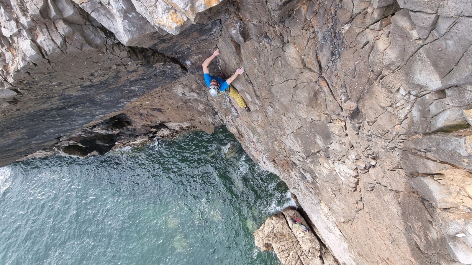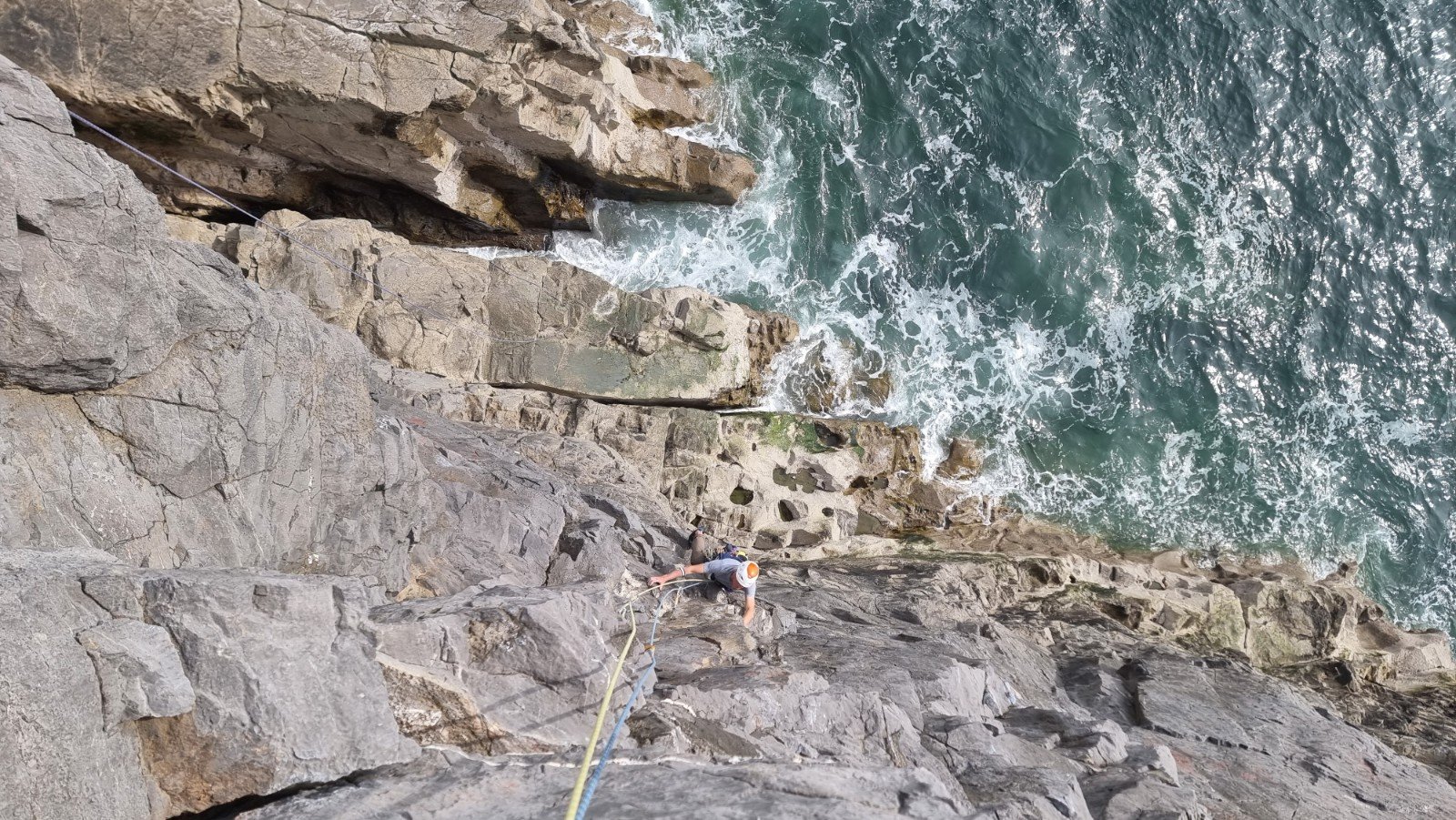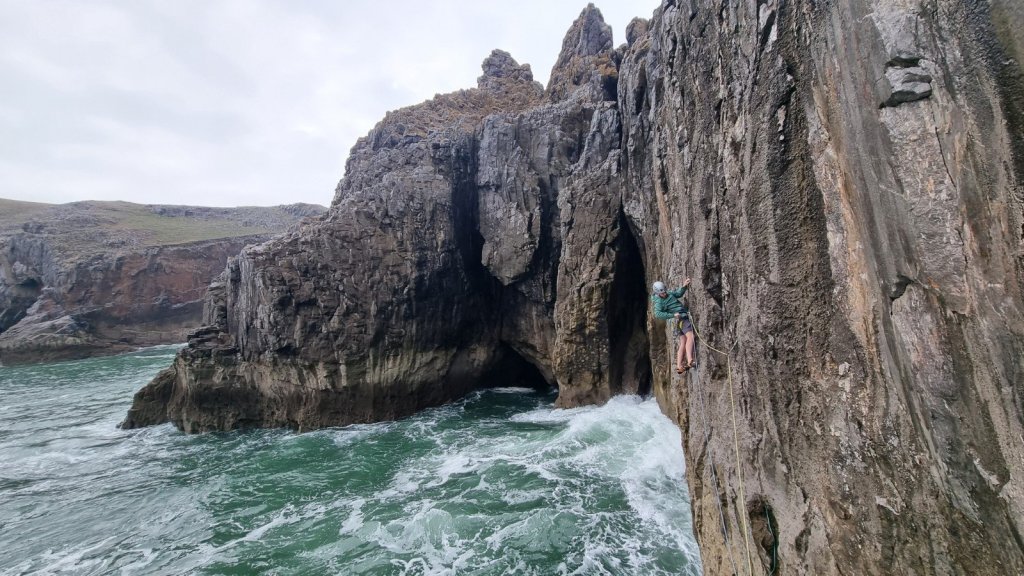 Here’s Jake on the crux pitch – you only need to see where the ab rope touches down in the sea to gauge the angle…