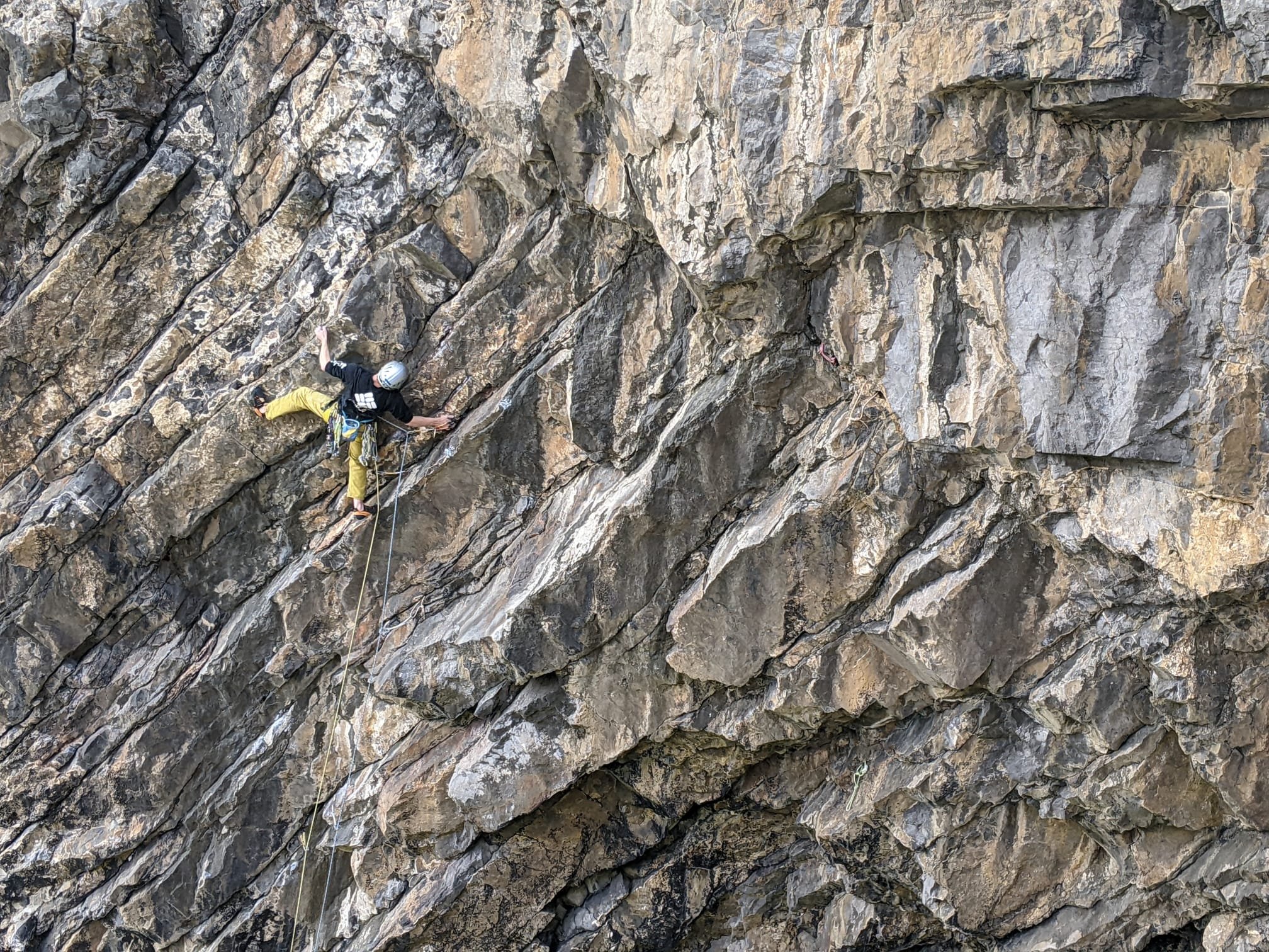 Here’s Jake’s logbook entry: Great route with some hard sequences on the first pitch, both burly and technical through the diagonal overlaps. Less of a clip-up than Klingon but the gear is good. E5 seems reasonable to me – Littlejohn must’ve been having a good day when he graded this E3!