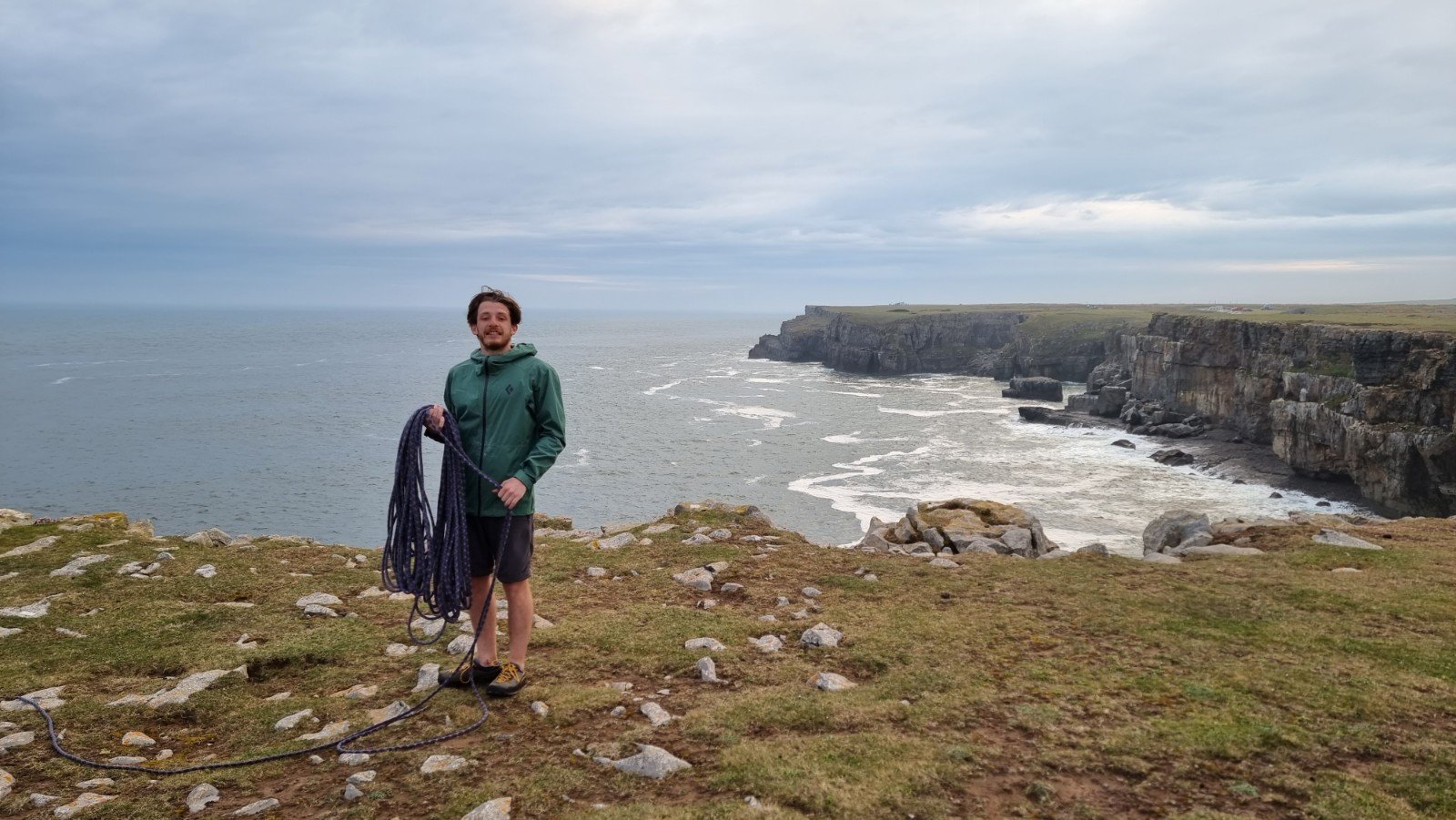With the rain finally stopping Jake was keen for a final route (I must be getting old as I was pretty happy to celebrate our unlikely YECTOYD). St Govans was at least non-tidal and nearer the pub, so we rapped down the Arrow to see what might be dry.