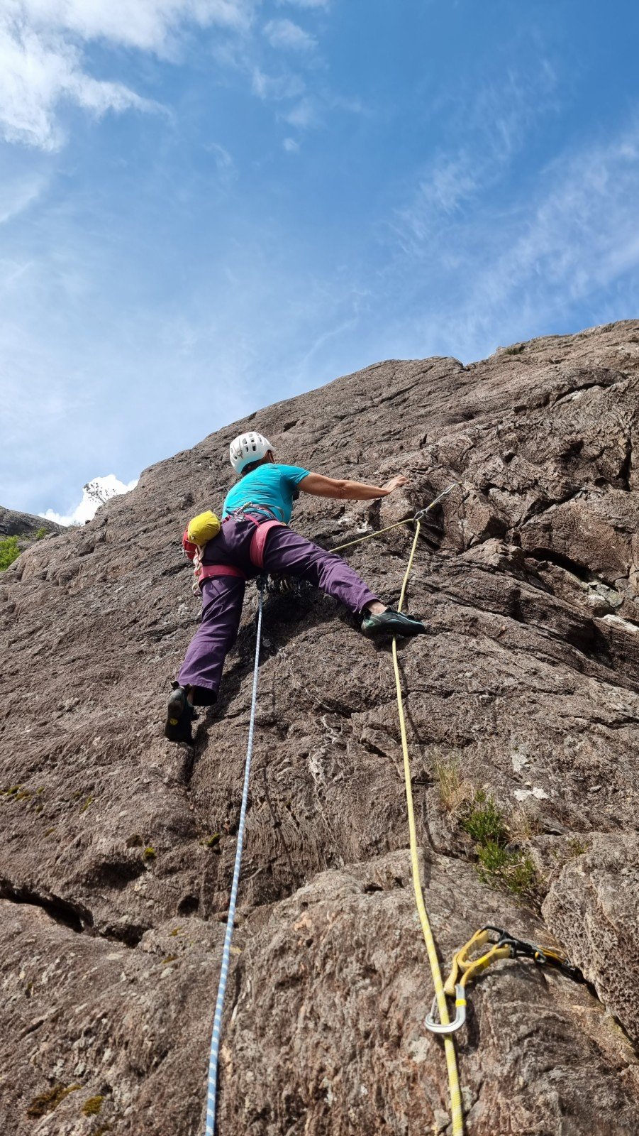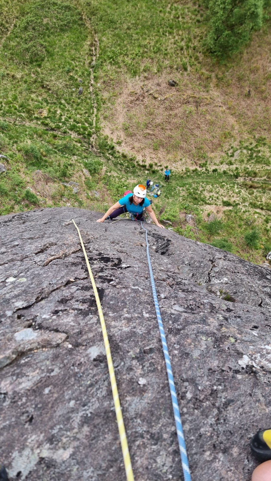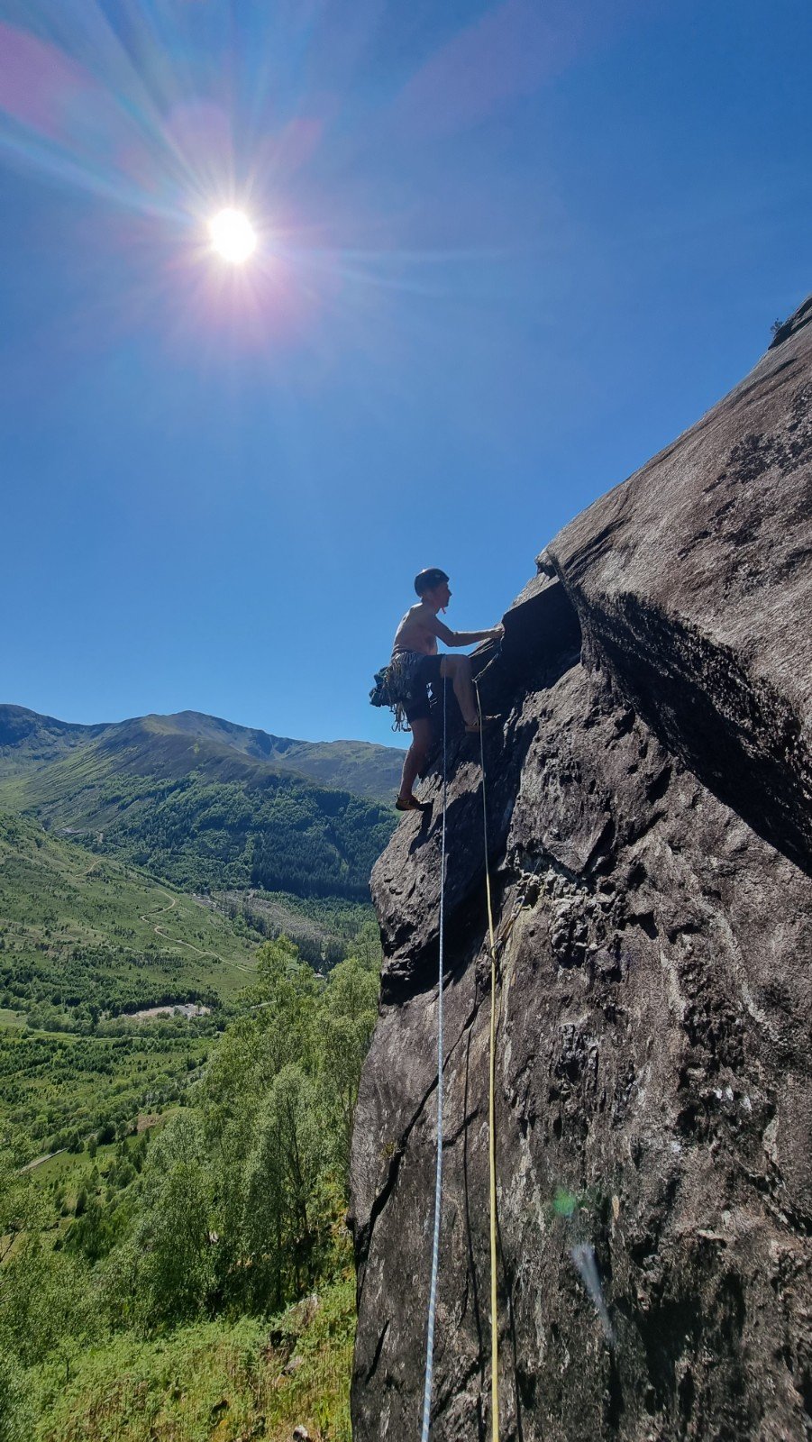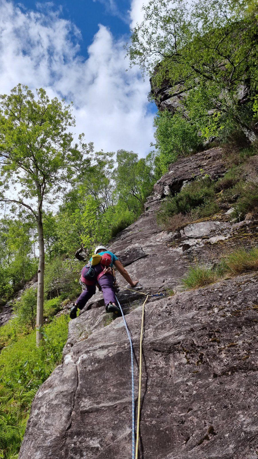 A change of scene, but still in Glen Nevis, Steall Gorge Crag is accessed from the parking area right at the end of the road. It also serves the hugely popular tourist walk to Steall Meadows and the Upper Falls. Over the Jubilee weekend, the parking and driving situation in the Glen was carnage (or CAR-nage) with numerous drivers unused to single track roads complemented by motorhome renters wielding their 8m juggernauts. Luckily we managed to squeeze in a little further down the road and without abusing any passing places.