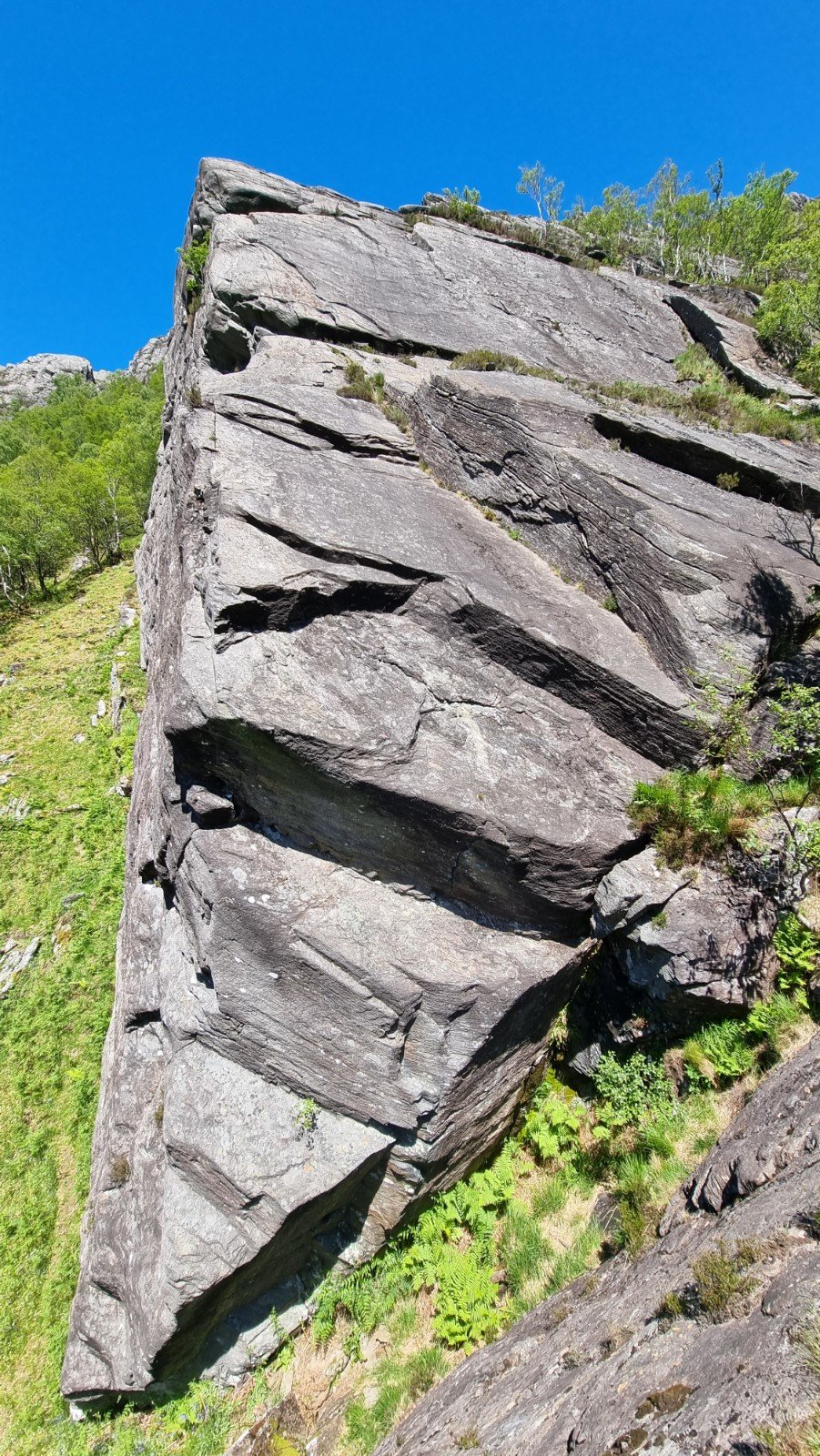 Here’s a view of the slabbier south face from near the foot of the Direct Route – there’s 3 pitches and about 80m of climbing up there!