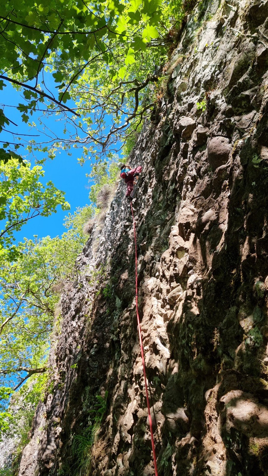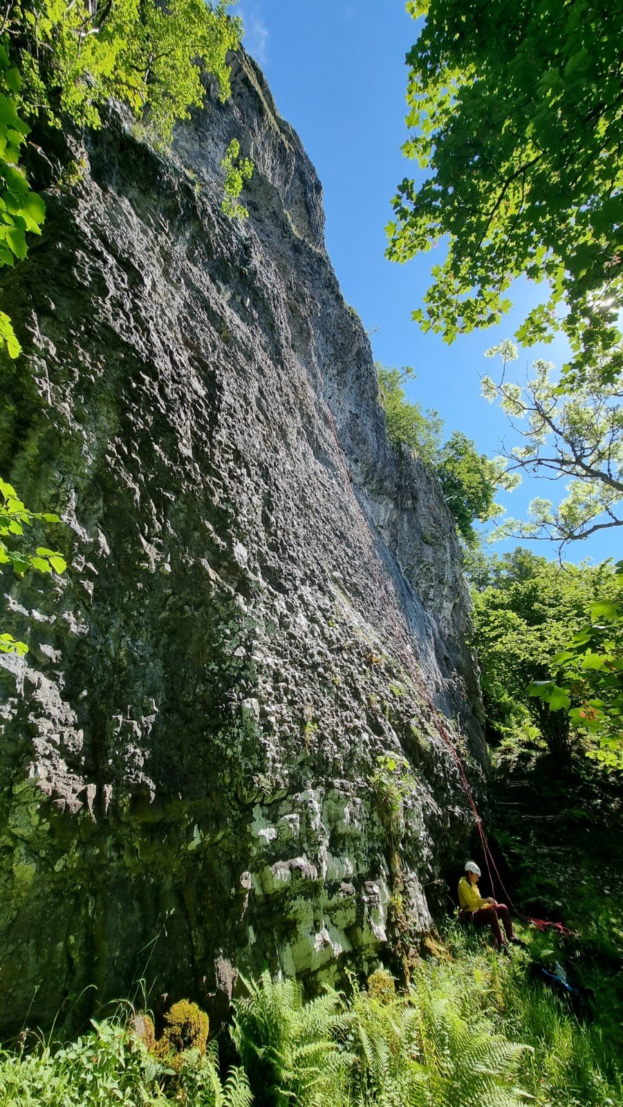 The routes have been mostly put up over the last year or so by Andy Corbe, who we happened to bump into finishing off his latest project. He’s done a great job in terms of the kit he’s used – nicely spaced glue-ins with twin-ring loweroffs. Thanks Andy! The rock is conglomerate with (I’m guessing) a limestone matrix full of water-worn igneous rocks and pebbles. Inevitably, with a new crag of this nature, the routes are still “bedding in” but they’re already more solid than many long-established Peak quarried venues, and with a bit of traffic there should be some real classics.
