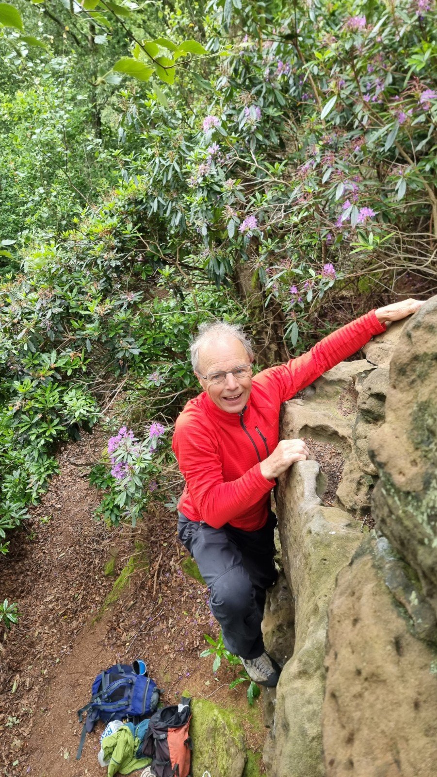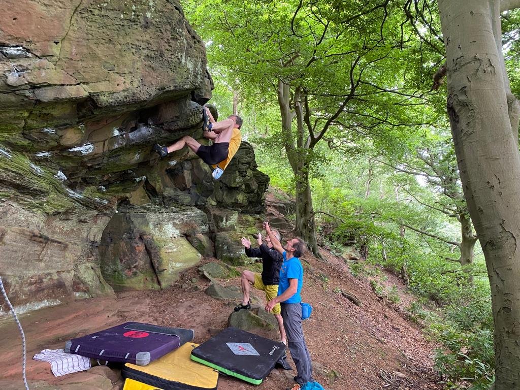 The climbing is on a series of isolated buttresses along an escarpment, with highly featured, stratified sandstone. The outcrops aren’t huge, but what they lack in stature they more than make up for in steepness! Highball bouldering is the main game, though top-roping might be a more sensible option if you’re in any doubt – the “High” in “Highball” is fully warranted. The grading is also a bit under-generous and a f5 could easily feel like E2 5b, depending what mood you are in. Surprisingly there wasn’t a huge amount of chalk in evidence, but luckily we were accompanied by local gurus: Rob and Dave, with an encyclopedic knowledge of all of the moves.