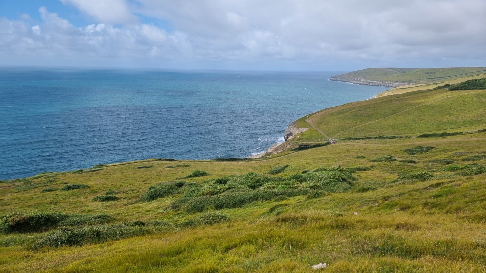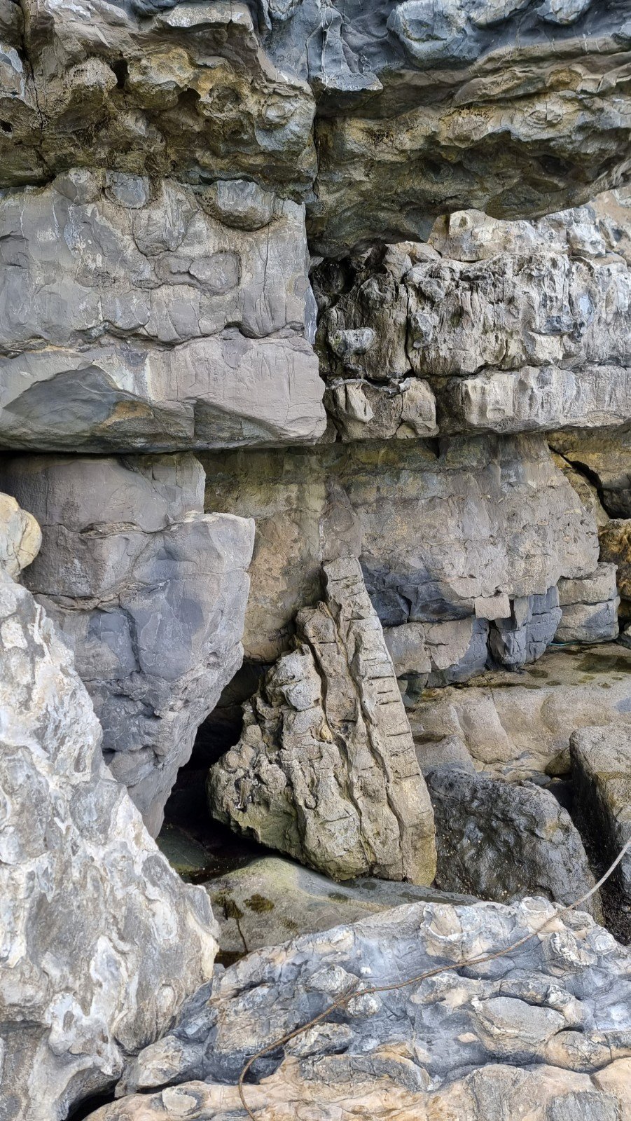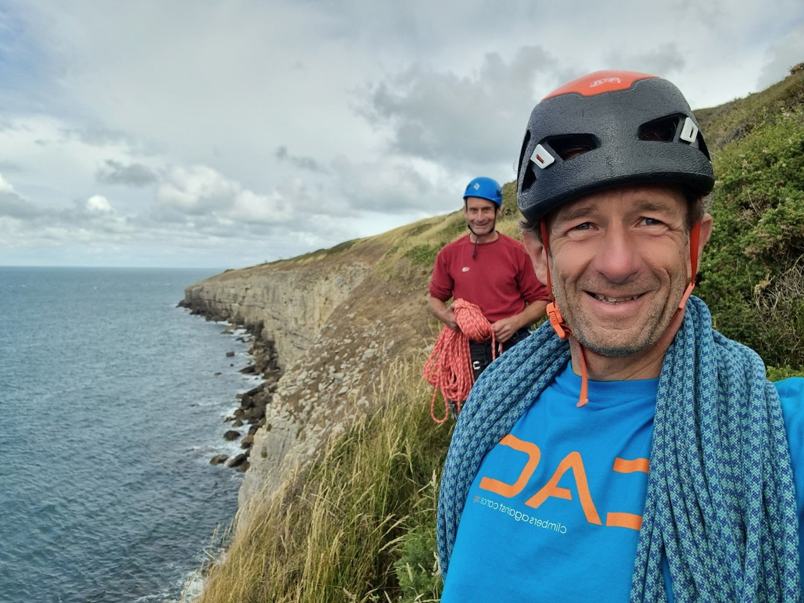 Boulder Ruckle is arguably the main event at Swanage, and has a reputation for being a bit hard to navigate your way around and being the home of some of the most crumbly and brambly top-outs anywhere! Both are somewhat justified! To help alleviate the later it can be advisable to leave a rope in place to protect the last few harrowing meters of vertical earth and choss, but of course that relies on you knowing where the top-out is. We went in search of Jo, HVS and Thunderball, E1, both of which rank in the Top 50 and are conveniently adjacent. To save you the harrow, here are the GPS coordinates of the point where the path leaves the main coastal path: 50.591704,-1.9698023 and of the actual Joe Belay Post: 50.5914319,-1.9701511