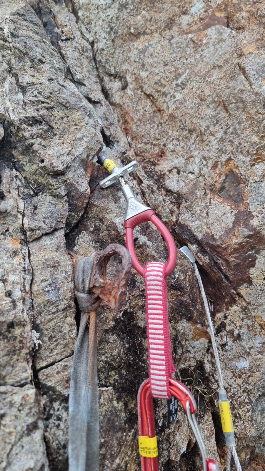 Here’s the peg / rusty relic that you’ve just entrusted your life to, and the much more reassuring wire (superlight rock 4 fitted nicely) that you are about to rely on to protect the next 20ft of slabbiness.