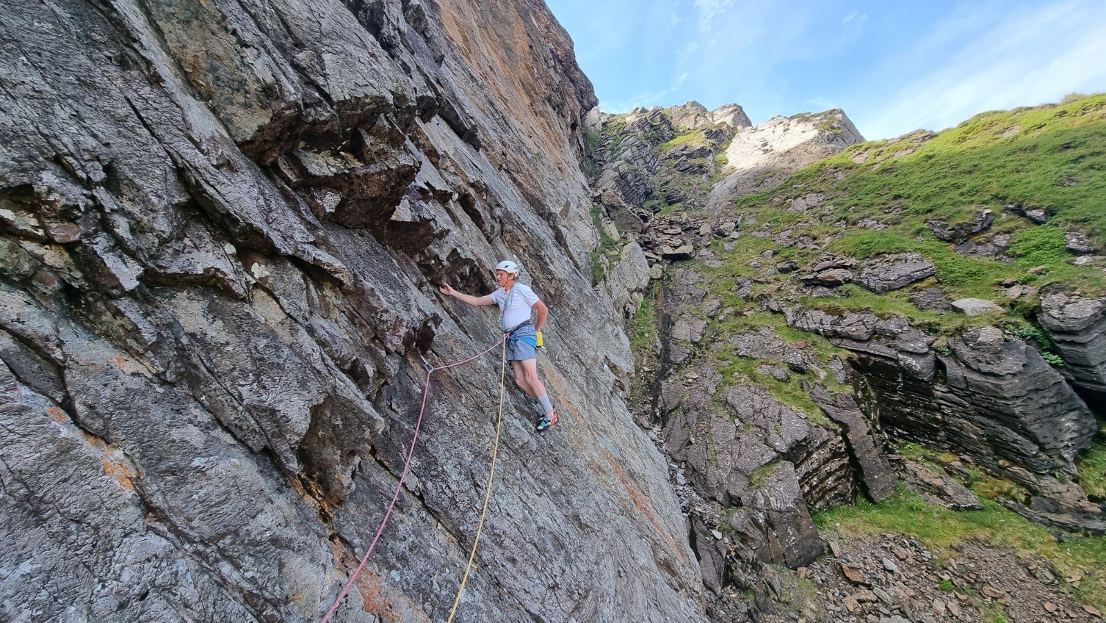 After seemingly endless traversing you finally start heading upwards and the the P3 5b groove pitch feels much more like regular climbing. There’s even a decent amount of gear, which helps soften the anxiety from the occasional loose hold.
