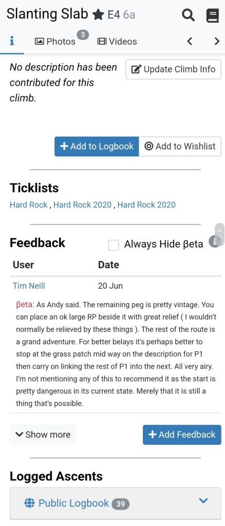 The route was originally climbed via a couple of aid moves on situ pegs, enabling the initial crumbling overhangs to be breached to access the sweeping slabs above (and a few hundred feet of more conventional E2 climbing). The first of these has long since disappeared leaving a solitary ancient lump of rust sporting some tied-off tat at the lip of the roof. The roof has been climbed free at least a couple of times (kudos to Ian Carr!) but it’s a totally unappealing choss-fest – and anyway, it’s described as an aid route in the great book!
