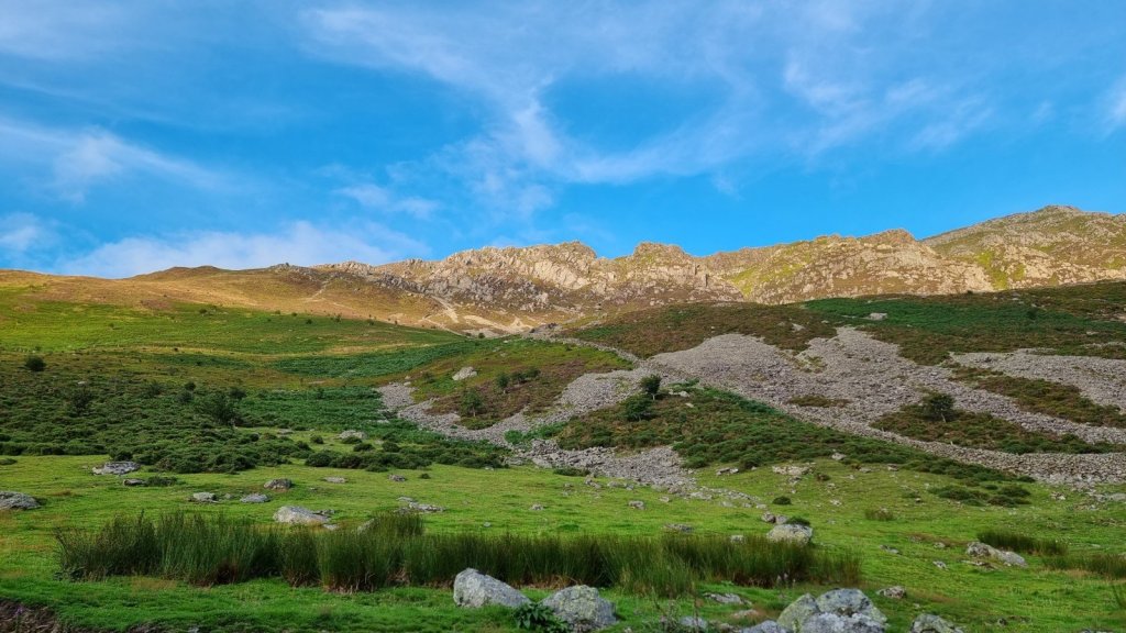 Although the crag is immediately above the A5, a direct approach would involve about 600m of vertical scree and heather bashing. Instead, a looping route gains height gently and brings you to the top of the crag in about 90 minutes: