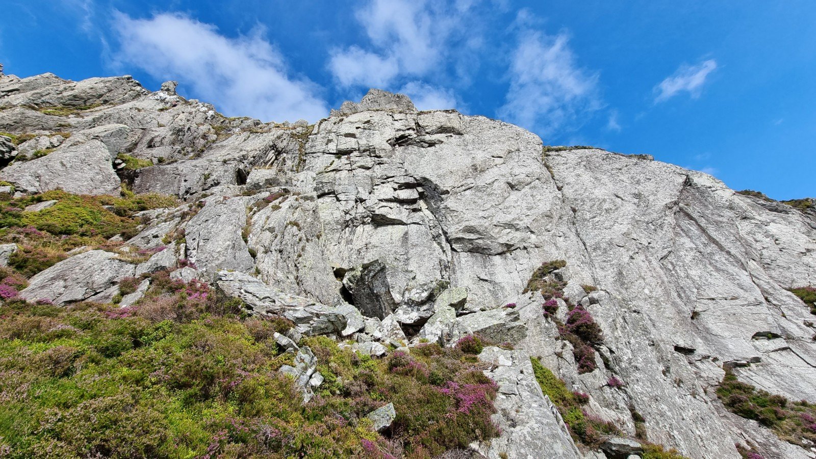 … from which a 30m ab gets you to further scrambling down and leftwards (looking out) to the foot of the routes. The terrain isn’t for the feint hearted, though it’s reasonably straightforward, and the paradise of heather and bilberries is worth the effort alone!