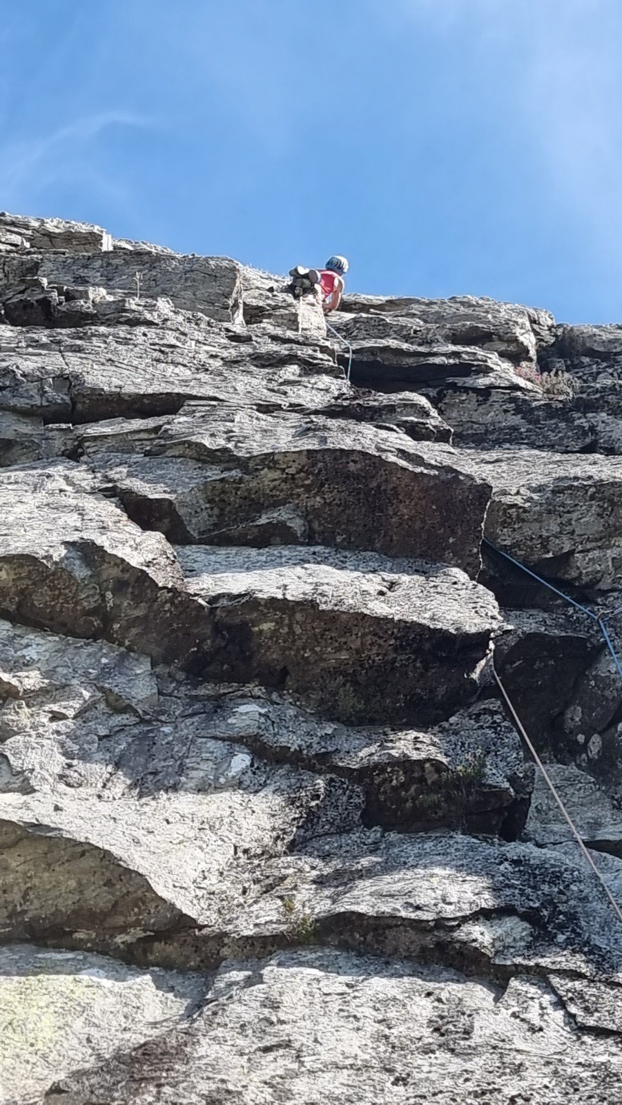 The second pitch pieces together the best of the remaining rock, but is really only a way off in comparison (though hard won with major excavations to unearth it!) Here’s George topping out on pitch 2