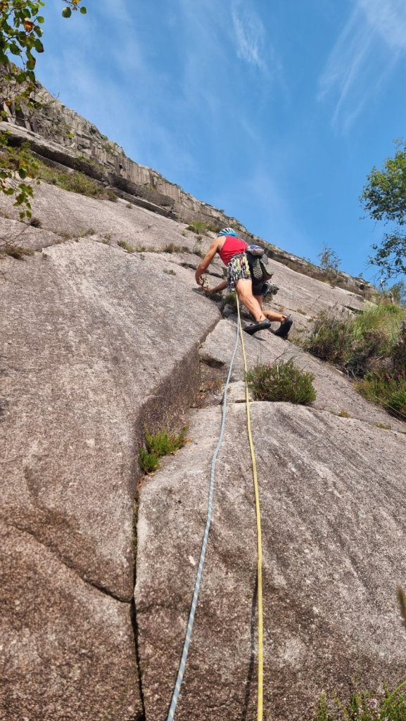 Next comes the “Quartz Vein” (don’t you love routes where each pitch is worthy of a name?) which follows the eponymous feature for about 30m with only a couple of bits of gear for comfort. Only 4c but quite thought provoking and great fun.