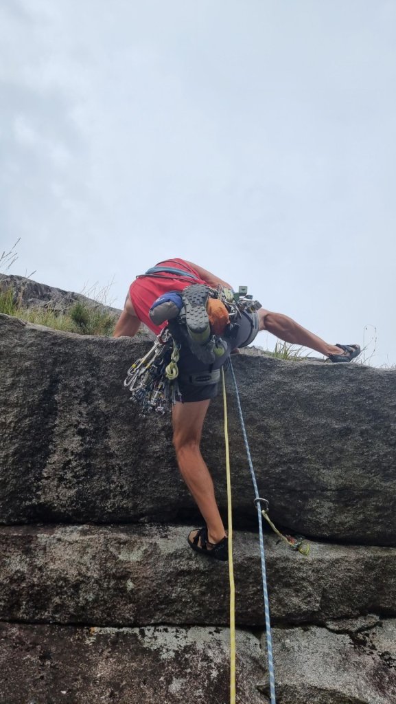 This is only a couple of inches wide, with good footholds interspersed with verdant foliage, and nothing much in the way of gear along the way. I was silently congratulating myself on my good fortune in seconding the mantleshelf move when I realised I’d be doing it with the rope running horizontally to George with nothing but a dodgy gold cam inbetween (a big blue camalot might have been better). Definitely “don’t fall off” territory!