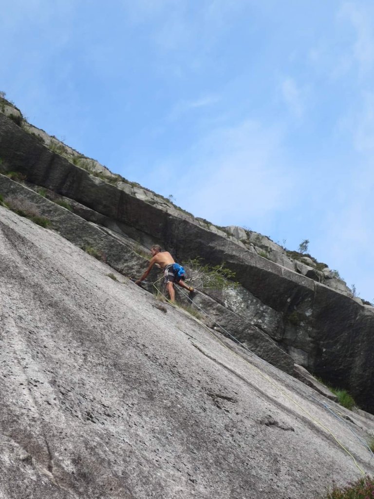 George soon joined me at the end of pitch 5 and things were looking good with only an hour and a half or so of climbing under our belts and just 3 pitches to go. I ignored the first few spots of rain – they evaporated instantly on impact and in any event it would soon pass. George’s wise council: “let’s give it 5 minutes” was very sensible given the runout nature of the climbing, and turned out to be prophetic. A cloud burst changed the complexion of the day entirely, and within minutes we were soaked and shivering with the crag literally turned into a waterfall (bizarrely a warm waterfall, heated on the sun-drenched slab)!