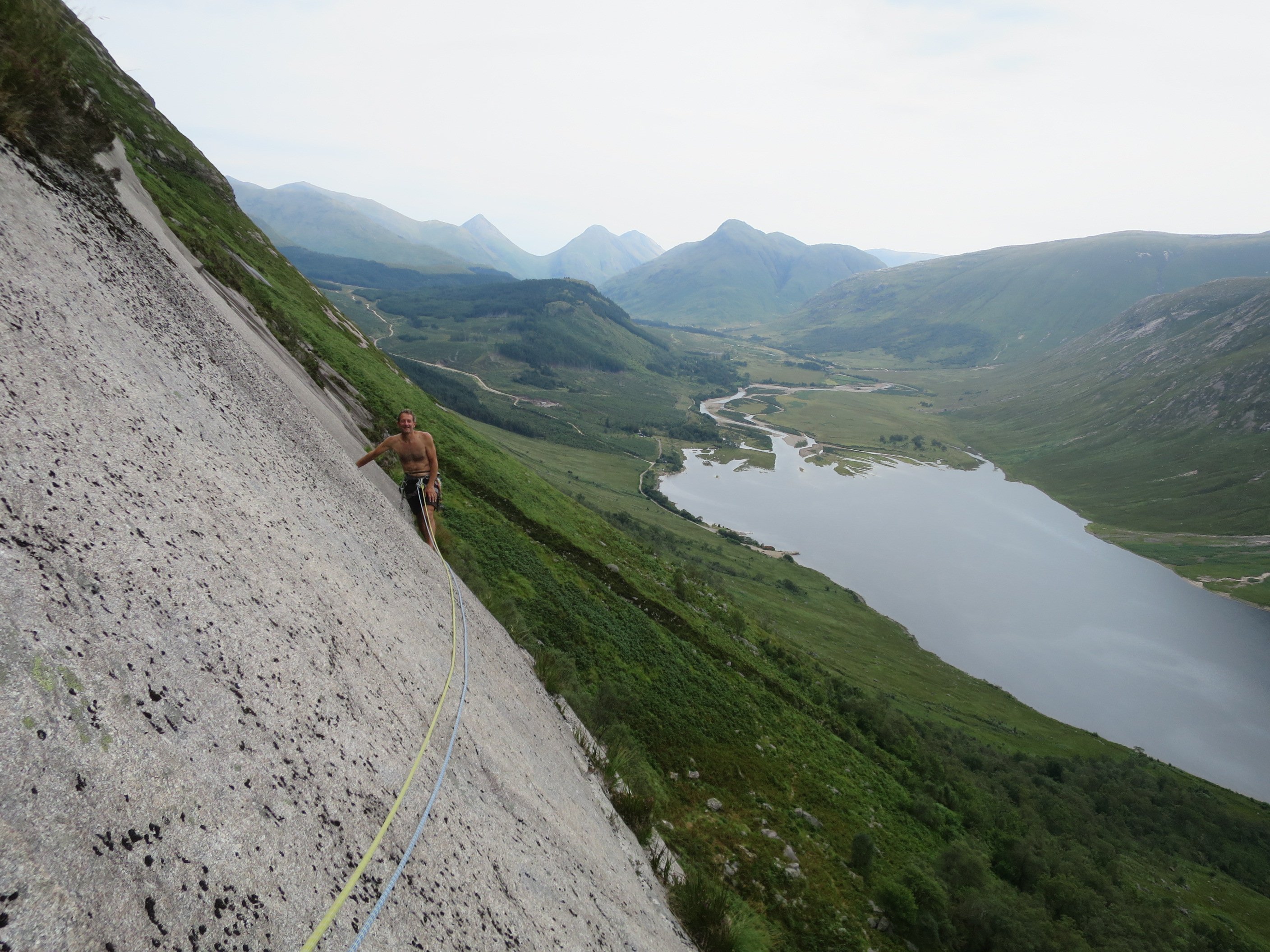 George set off confidently up the first 5a/b pitch (confidently is the only way to climb on Etive Slabs!) and was unperturbed by the modest amount of gear – the friction was excellent.