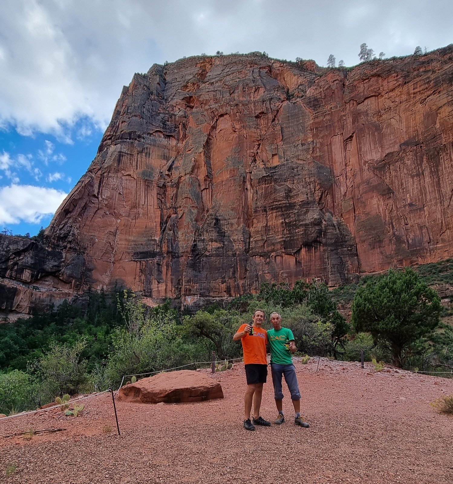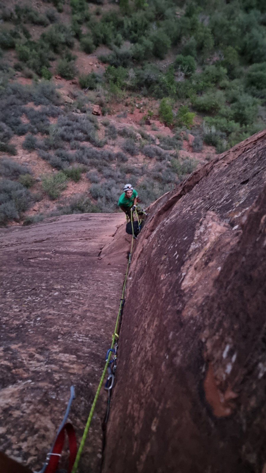 All that remained was for Bill to lead us onto Angel’s Landing via an easy but grungy chimney and sandy slab. Topped out before 5pm and chatting with the hoards on the trail: “You came up there!?” Barely a cloud in the sky all day, and not a drop of rain.