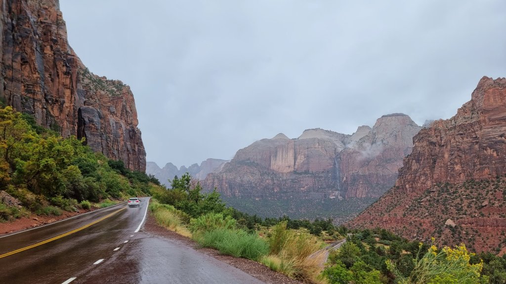 Newly installed in yet another campsite, a leisurely repast of chip’n’dip and avocado, followed by pasta in a four-cheese sauce was washed down by modest quantities of beer. As we turned in for a well-earned kip, on the dot of 9, the heavens opened (and stayed open for much of the night!) By daybreak I’d had a useful reminder of the importance of pegging out your tent, even if you’ve had a busy day and the packed earth seems inpenetrable – my inflatable mat was afloat in my own personal sea. Thirty minutes later, with a boot full of soggy gear, we were bidding farewell (or hopefully au revoir) to a very damp-looking Zion – climbing on wet sandstone is not to be recommended and this was going to be out of action for a good couple of days.