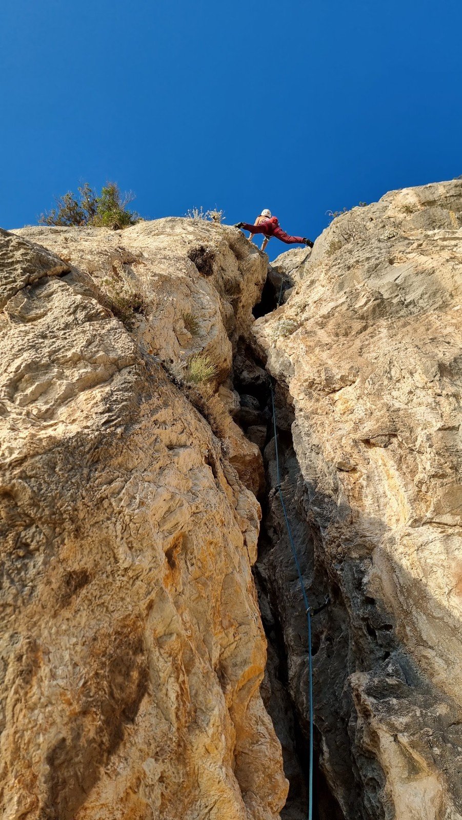 … so we were quite surprised by the arrival of a couple of other pairs – and then even more surprised to find they were Brits (the first British climbers we’d met in a month); and then less surprised that one of the team was none other than Steve, the crag developer, giving the grand tour for a couple of visiting friends. Anyway, nice to be able to say thanks for all the hard work that’s obviously gone into the routes. Here he is in action, maybe on Razibriga, 6a+?