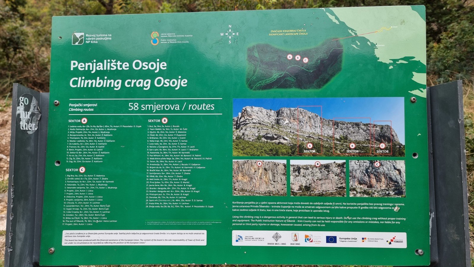 Sure enough, it was a chilly start the next morning and we were up and about early to make the most of the day before forecasted rain in the afternoon. The Central sector of Osoje has a real spread of grades from 4a to 7a, mostly 25-35m and very well bolted. It even features a topo board, complete with credit to the EU funding that supported much of the original development here…
