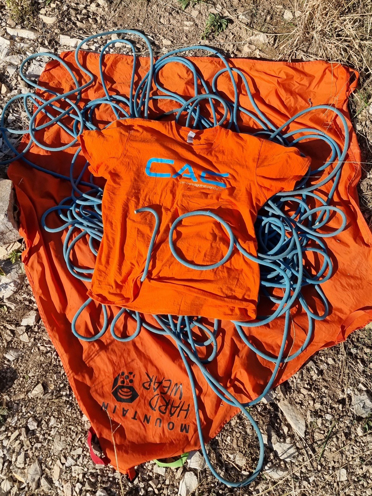 Shirtless by now, of course, I almost lost my CAC T-shirt in the camouflage of our matching tarp and rope. This prompted a bit of artistic licence on becoming a trustee of Climbers Against Cancer and looking forward to celebrating the charity’s 10th anniversary.