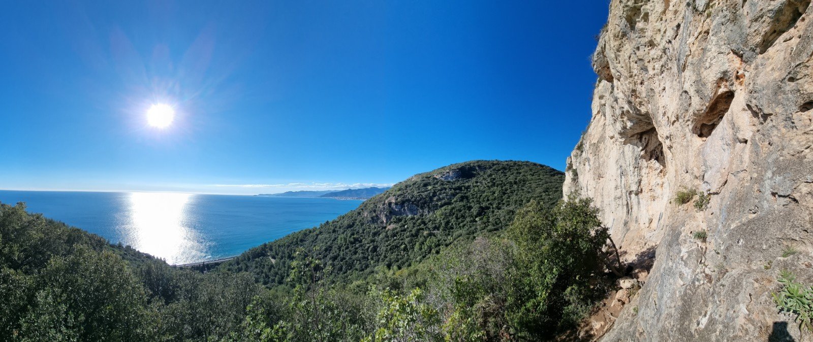 Much of the climbing in Finale is west facing, and with a cool start we set off to explore one of the exceptions – Caprazoppa sits directly above Finale Ligure on the coast road, looking out over the sparkling sea. Parking is a bit of a nightmare (there are a couple of cinquecento-sized spots at the spot indicated in the guide but otherwise you’re scouring for options on the narrow, steep approach road. Definitely one for folding your wing mirrors!