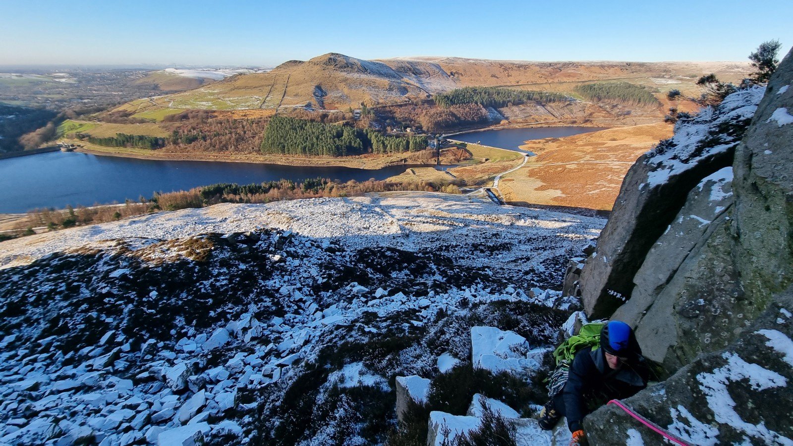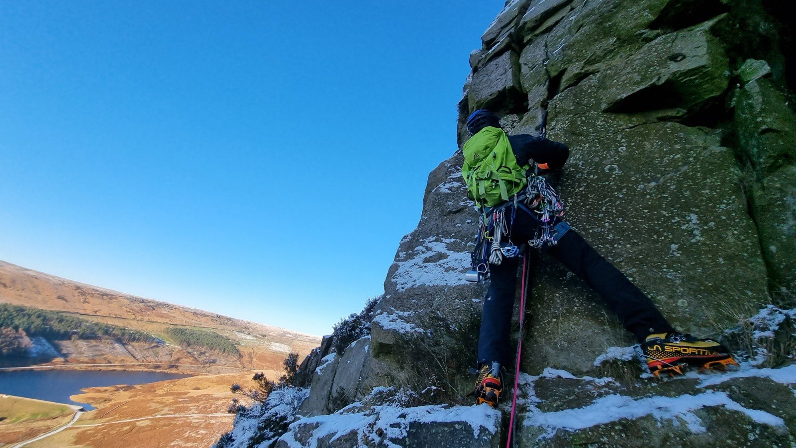 Dovies, a.k.a. Dovestones Quarry is a largely neglected and infamously loose, tottering quarry in the Chew Valley. It’s lack of popularity and northerly aspect combine to offer frozen turf and icy cracks, making it an unlikely, if esoteric, winter playground, only a few miles from Manchester. A Lu Te was Andy’s chosen objective (I defer to his far greater experience in these matters) a one-star Severe in summer transformed into a VI, 5 mixed winter route (at least according to Over the Moors). A good dusting of powder and occasional solid turf placement made the feat respectable, though it’s debatable whether crampons were a help or hindrance. No doubt about it being wintery though, and a great lead by Andy!