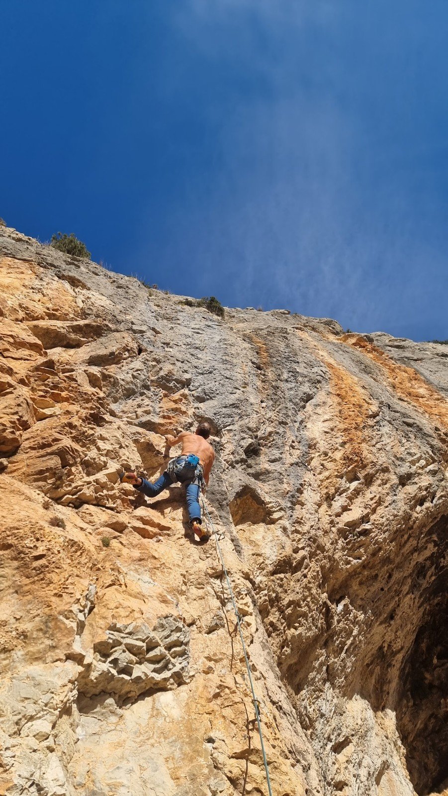 We warmed up on Diedro Aitana, a great, traddy 6a, and I couldn’t resist the temptation to press on for the 6c+ (7a on the rock!) extension. The extension pitches are far less travelled and give brilliant plonk-on vertical wall climbing on interesting crimpy rock.