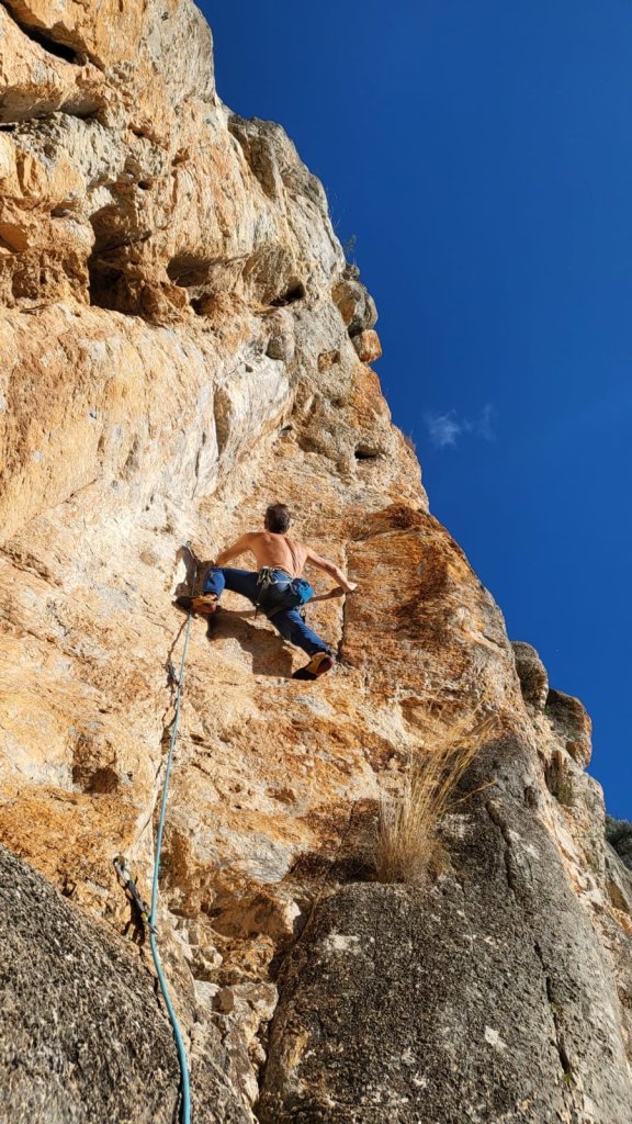 Further left, Jungla Toxica looked to be an equally inspiring if more disjointed line, with an initial 20m or so of fun juggery followed by an obvious crux through a blank overhanging wall split by a thin, pockety crack. Surprised and chuffed to get through this, I figured the remaining 15m would be a romp to glory, but a final leering roof had other ideas. Much puffing and panting, and a bit of cursing, saw me to the chain, having spent a lot of energy contemplating the potential lob off the final committing move. Lowering off, a curly haired local came over to congratulate me on a “great fight” 😎
