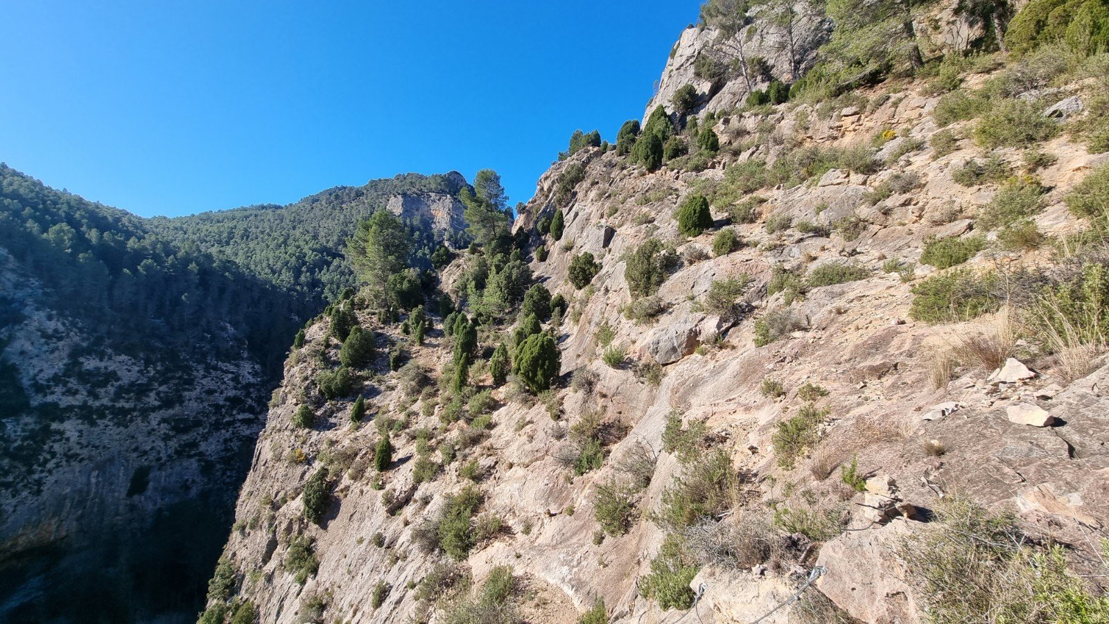 Fab, sunny wall with a good selection of 6s and 7s on the right, which we’d climbed on before. The left wall, perched above a huge drop, gives Verdonesque levels of exposure…