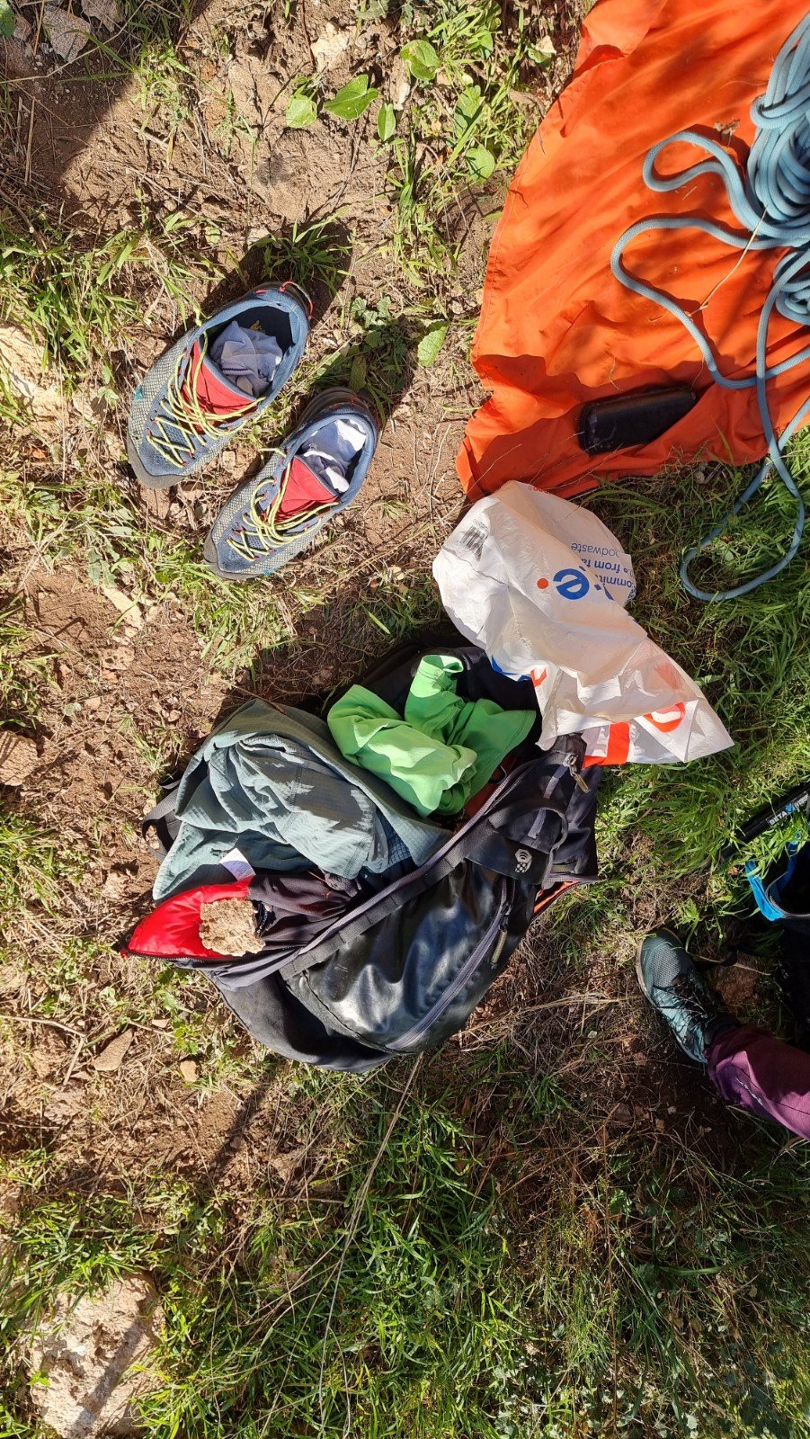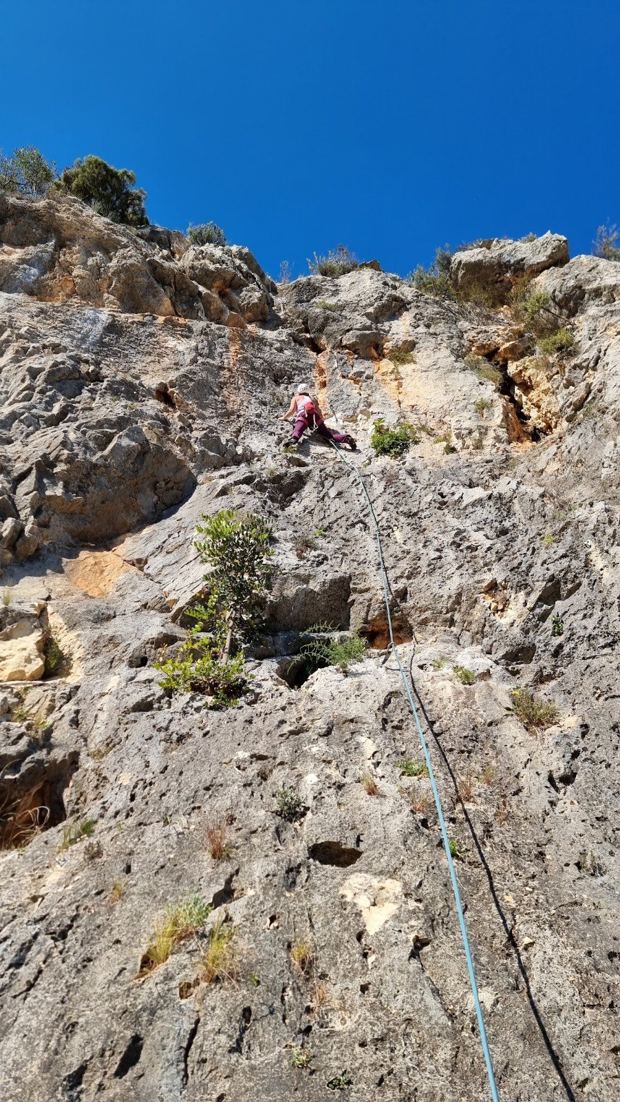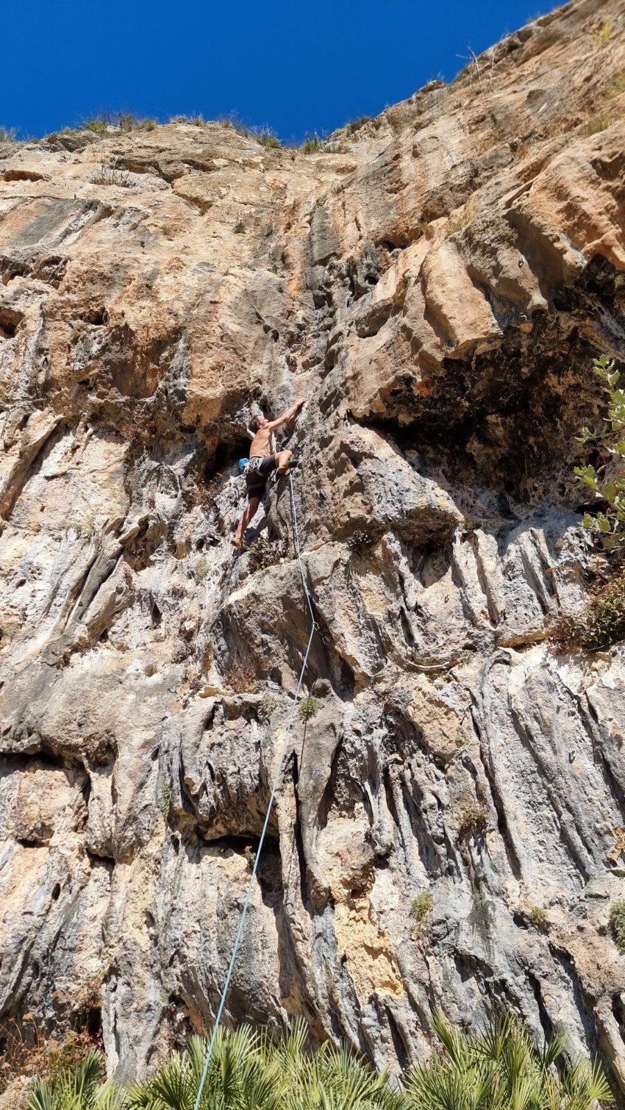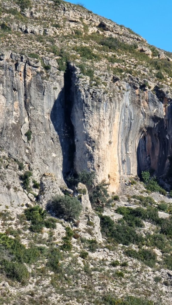 We visited on a semi-rest day, more in the spirit of exploration than expectation, given the predominant grade range, and the view of the giant orange breaking wave of rock didn’t auger well (definitely not playing to my strengths). The far right of the crag retained the last of the sun and also looked to have a stunning tufa 7a, with the promise of a 6b warm up, so we plonked the rope down there. Pitoscopia, 6b, was nails (a good 6c?) and a promised intermediate lower off didn’t materialise, so I bailed onto the adjacent one. This gave me an excuse to top-rope Jose Luis sempre, 7a, which is magnificent but also tough!