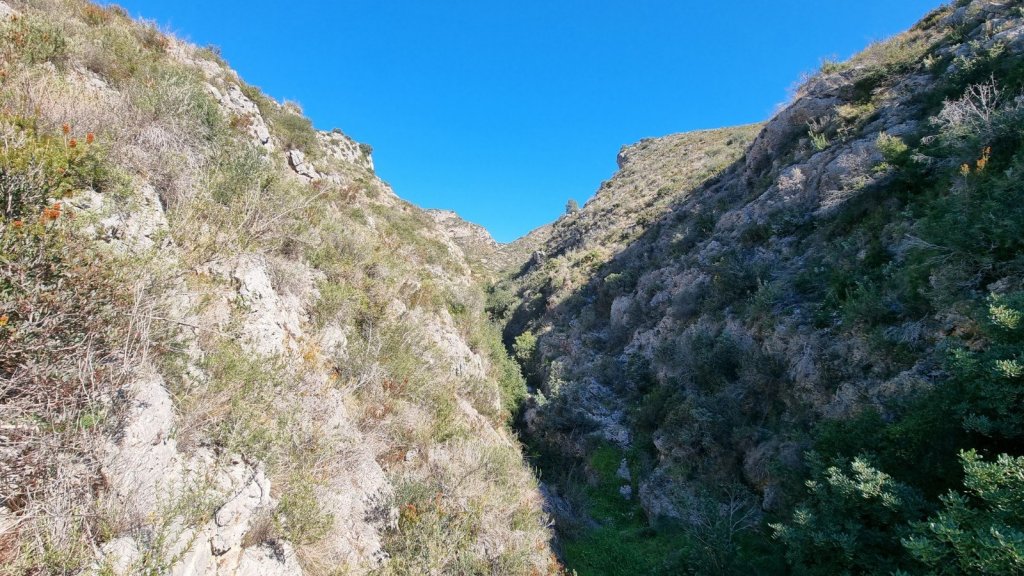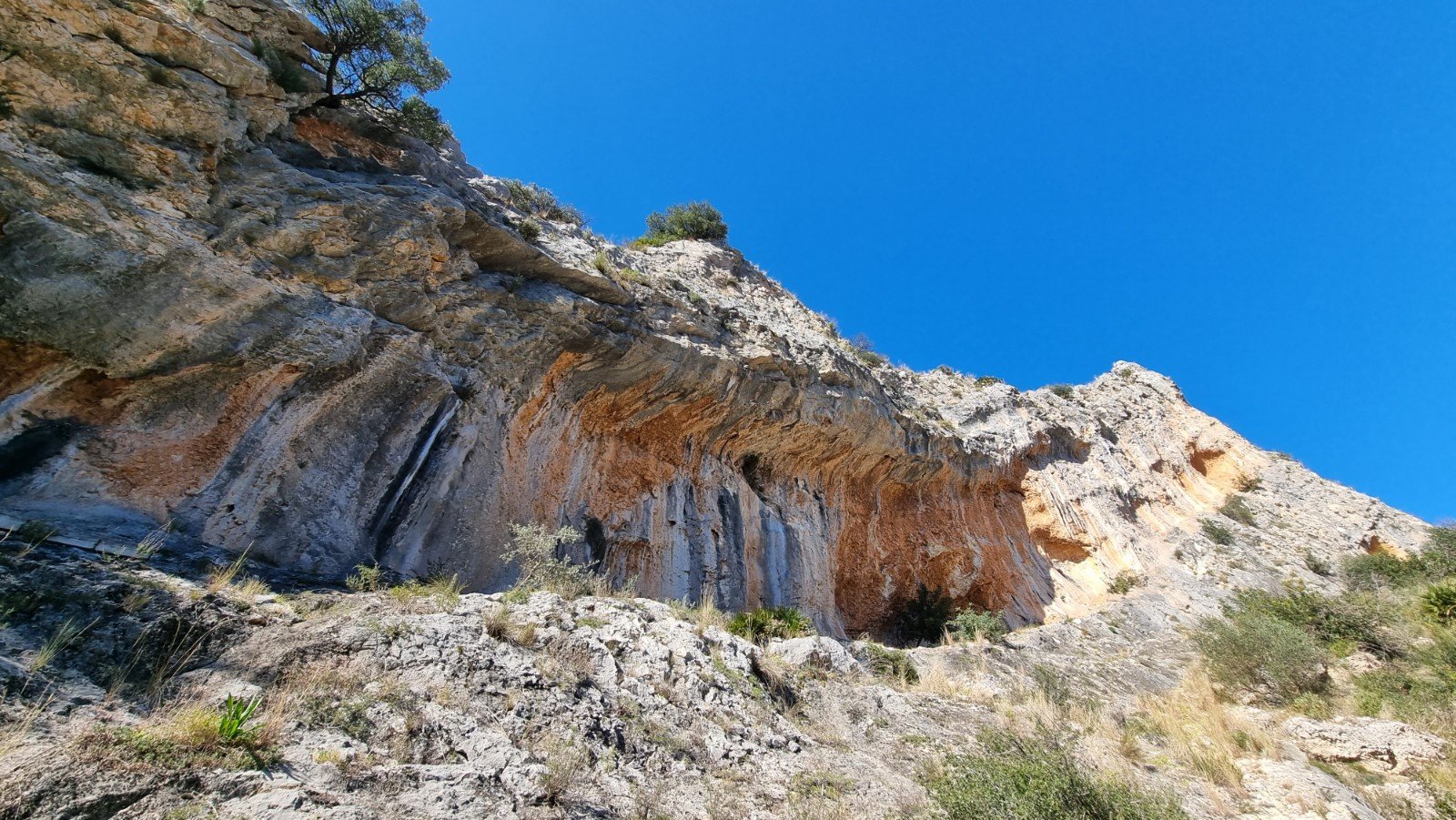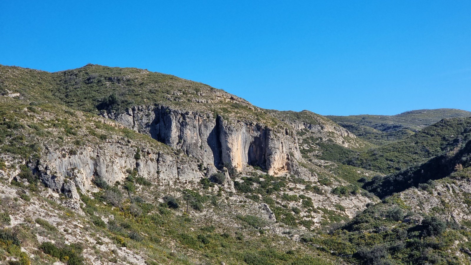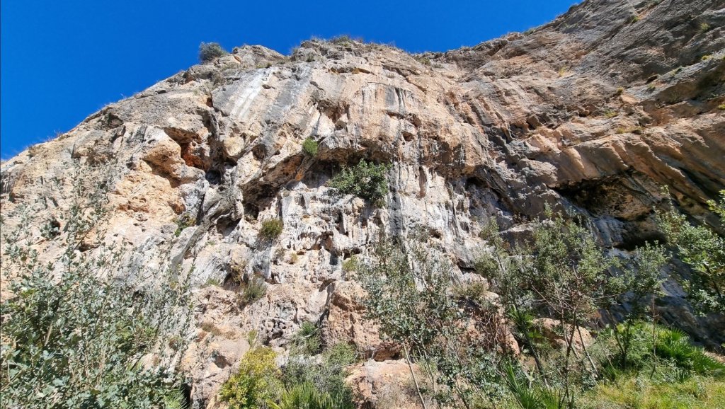 This sector is accessed from a parking just outside of the village 38.983103° N 00.333668° W next to one of the very neat signposts, and you turn right almost immediately to follow a good path through olive groves which then drops steeply down into a narrow dry riverbed.