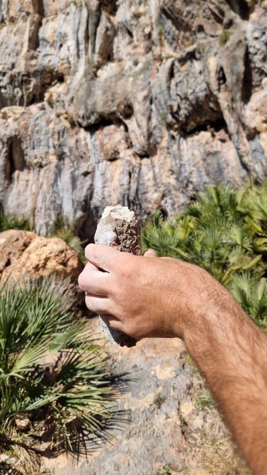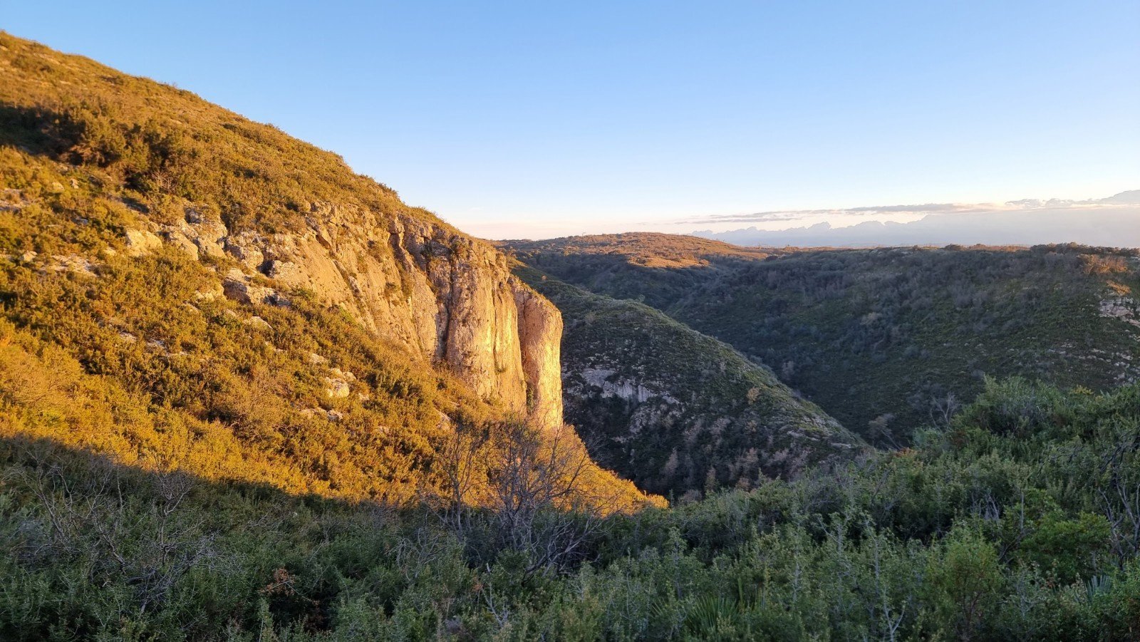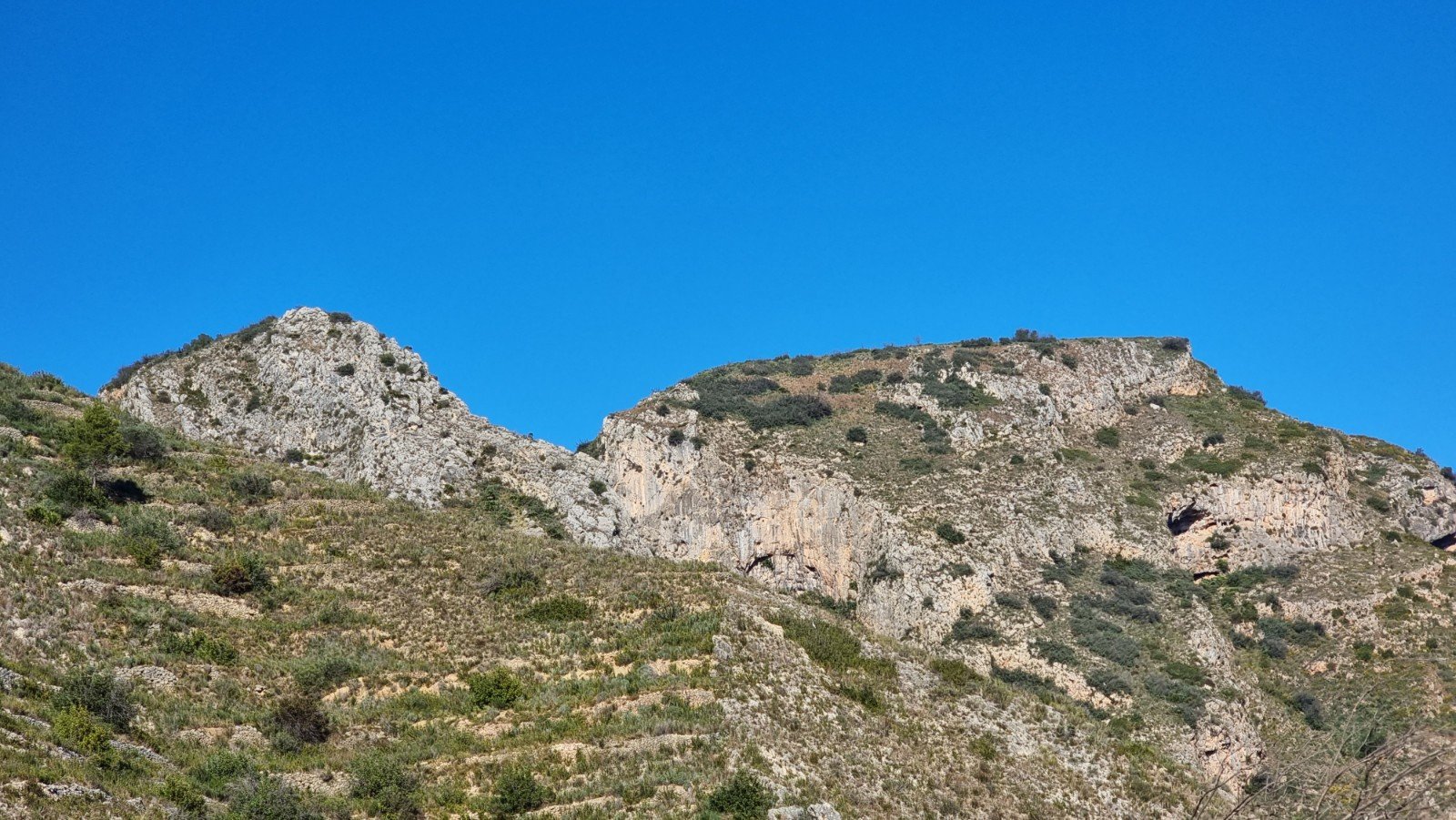 This sector is accessed from a parking just outside of the village 38.983103° N 00.333668° W next to one of the very neat signposts, and you turn right almost immediately to follow a good path through olive groves which then drops steeply down into a narrow dry riverbed.