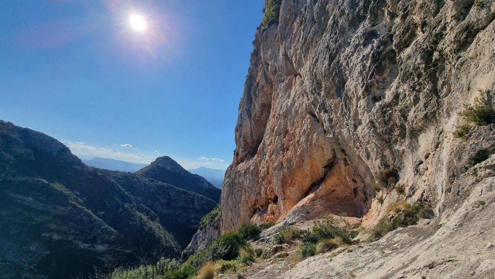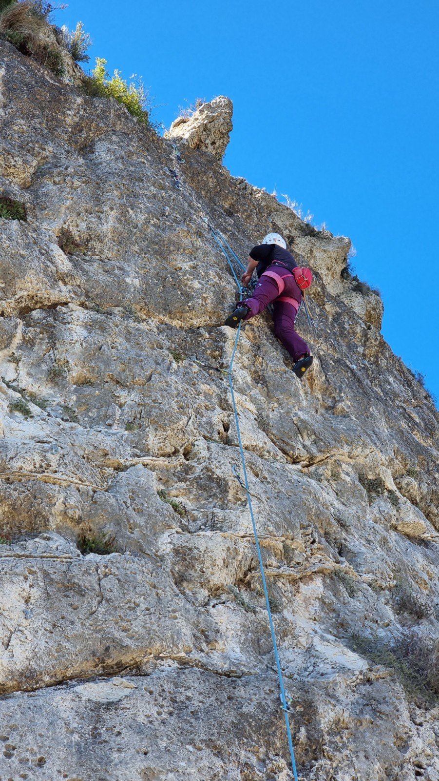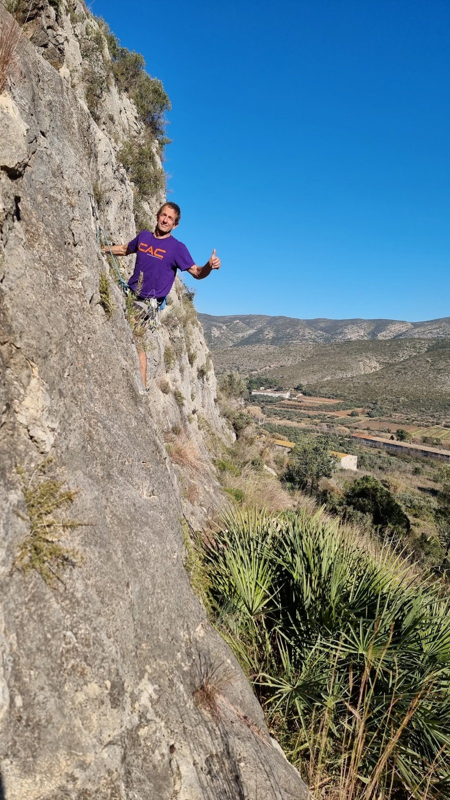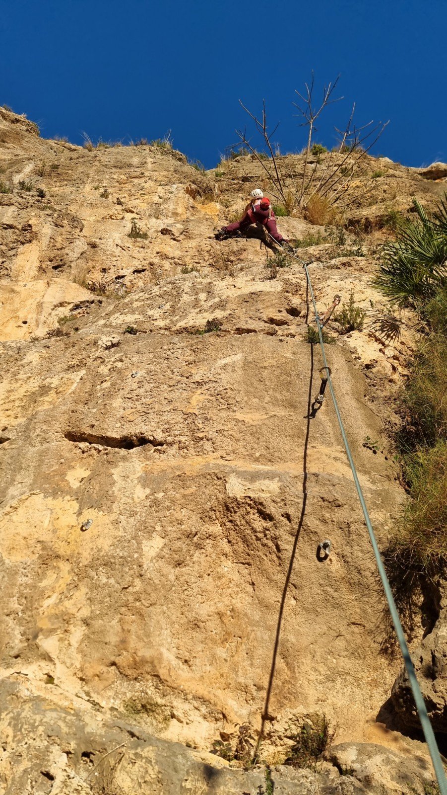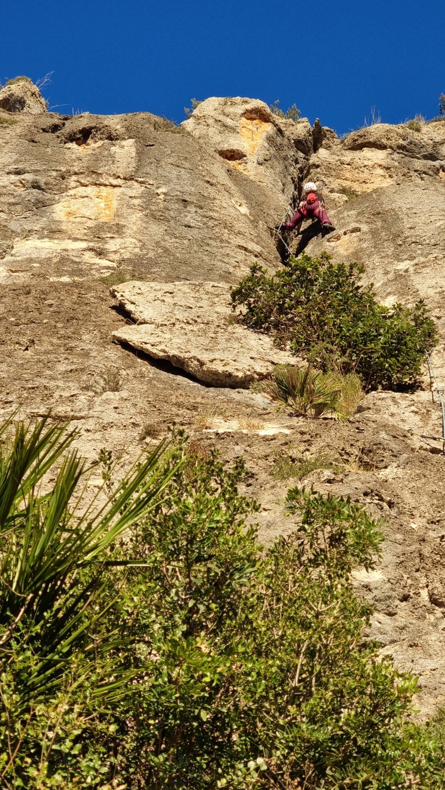Seeking the last of the rays for a lunch spot we discovered a couple of newly bolted routes not on the topo – the right hand one provided a fun consolation (felt like 6a/+ so will probably get 5 when it appears in the next version of the guidebook!) Don’t let me put you off visiting, and it’d be an excellent spot for a strong team in warm weather, and you could always explore Paret del Castell opposite (NW facing, only half a dozen routes 6b to 7a but a tonne more rock to go at!)