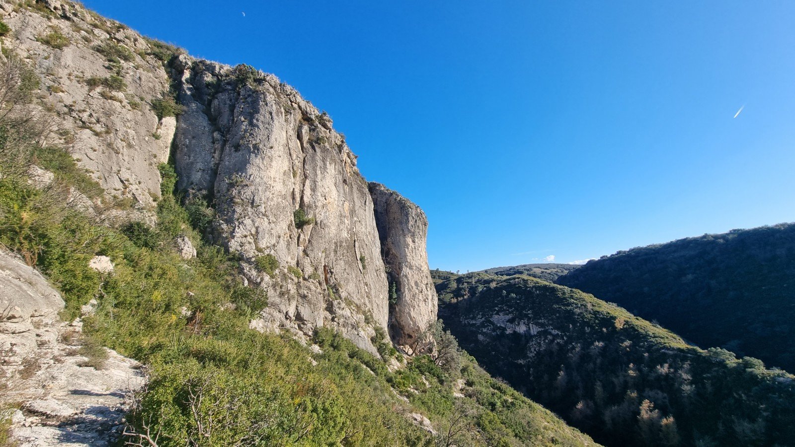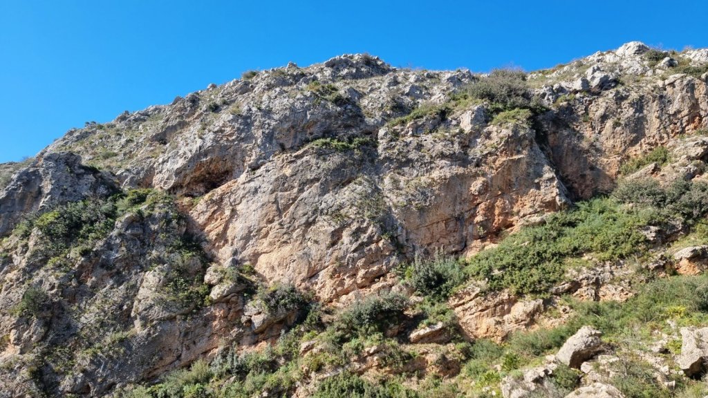 Then skirt a chain barrier and traverse the edge of an olive terrace for 50m right to drop briefly into a dry watercourse before following a decent path on the opposite side, up the hillside and looping back under the crag.