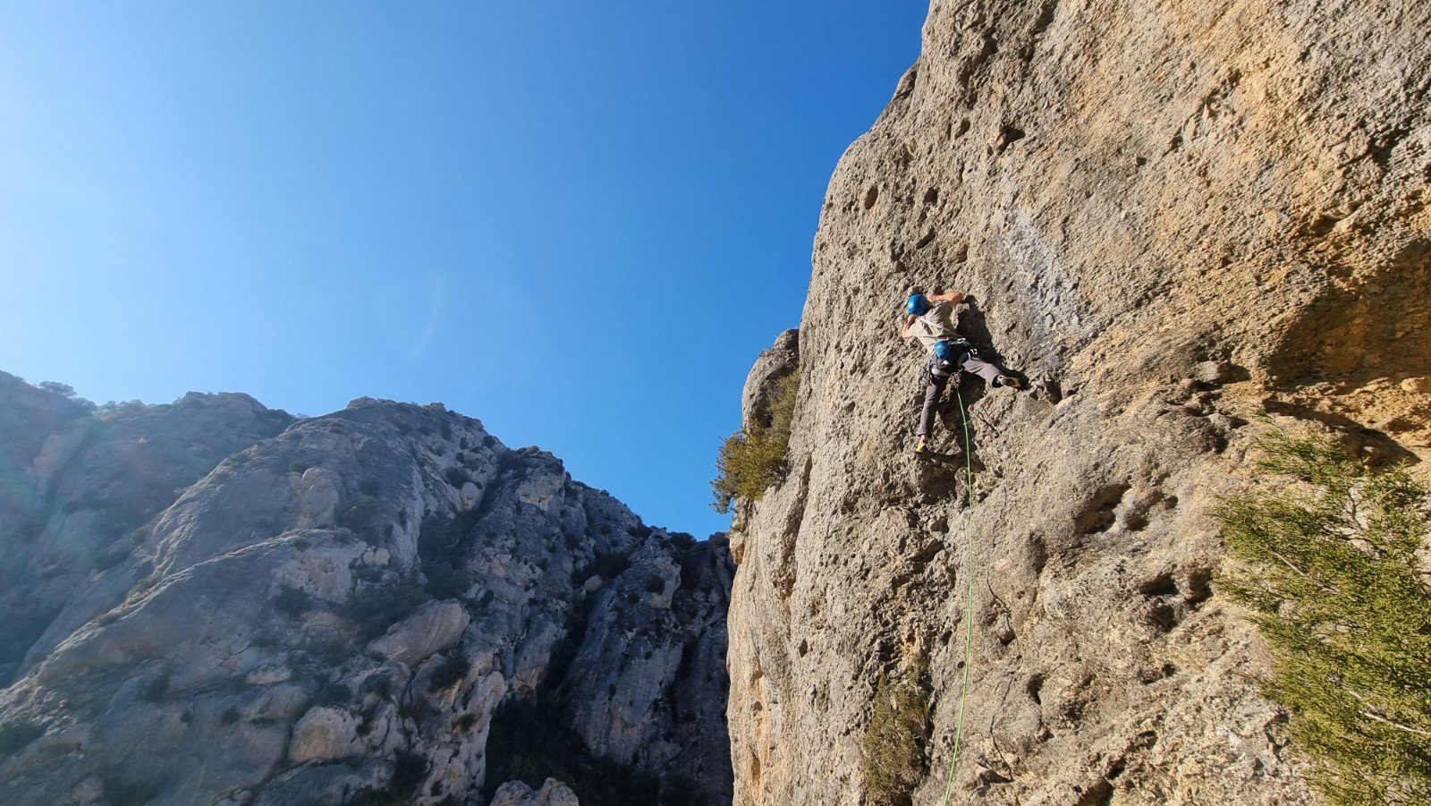 Freezing overnight, the availability of sectors which face every conceivable angle is a real bonus. Over the course of 4 days we explored most of the east-facing Peña de la Mesa crags on the south side of the road for our warm-ups, and were soon in T-shirts despite the modest air temperature.