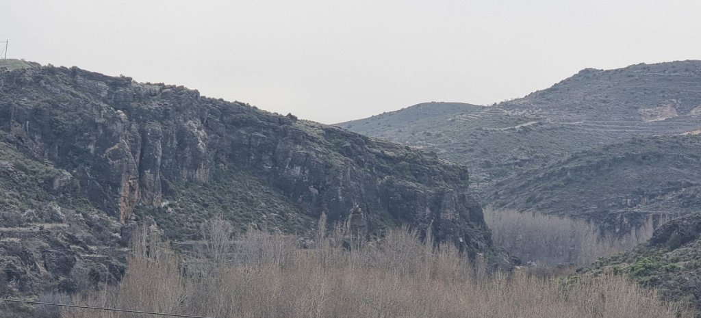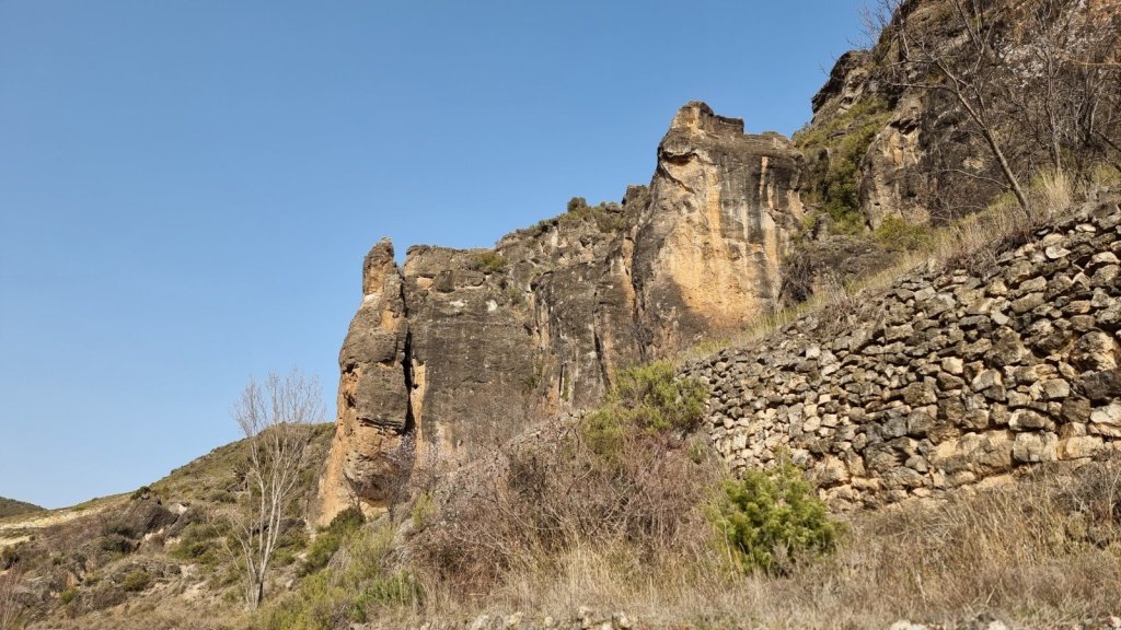 Immediately around the bridge over the river there are little sectors everywhere – there’s been a lot of enthusiasm and investment from somebody! Much of the climbing is shady (great if you are looking for it, but we weren’t) and also falls into the “short and steep” category, and we weren’t hugely taken by the look of any of it (and strictly speaking we were on a semi-rest day sussing trip). We decided to follow the path back up to the road to check out the final group of Rio Isuela crags. These form a west facing escarpment above the river and opposite the GR90. The first of these, Chopera Fuente La Pesquera, didn’t really fit the bill for us either: initially set above a stone aquaduct, the crag gets taller and steeper as you head leftwards uphill, culminating in a great bulging wall of high 7s and 8s.