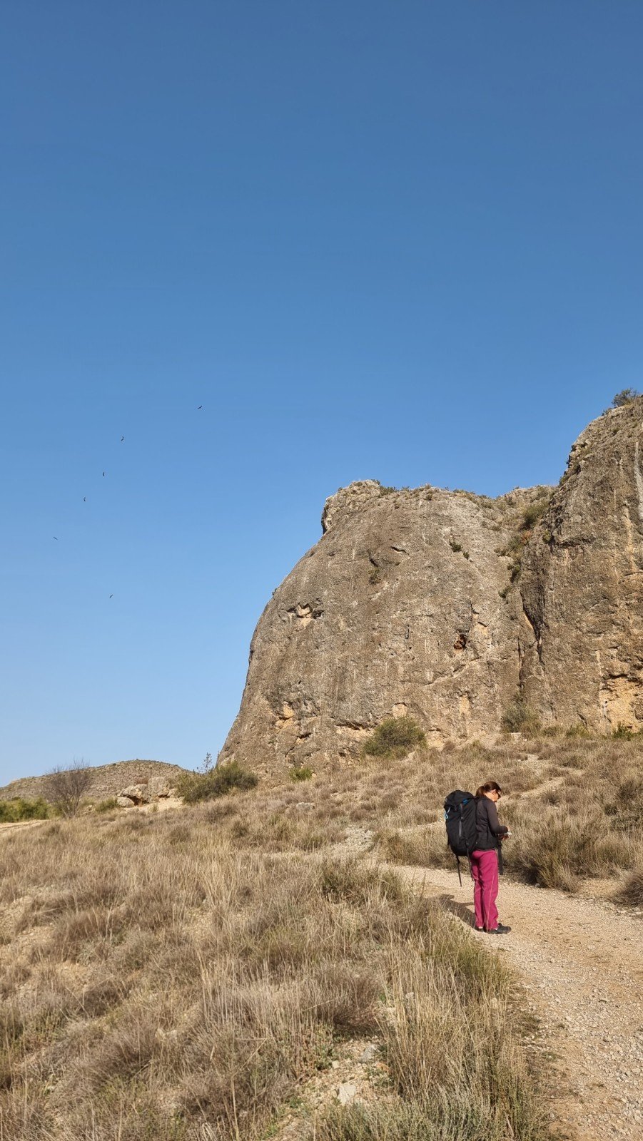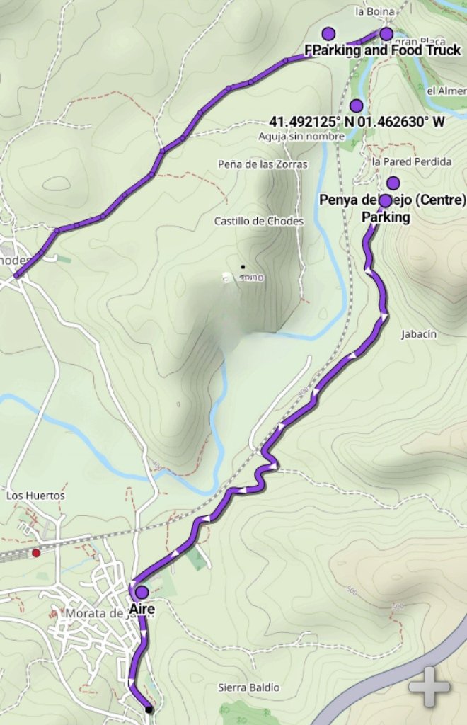 You can access the crags on the east side of the river / railway from the same parking, but we decided to explore the driving route to Peña del Reloj. This involves looping back to the main road, driving over the river bridge into Morata de Jalón, and taking another twisting dirt road into the hinterland (easiest to skirt the town to the east, rather than run the gauntlet of narrow streets through the centre! – see map above). This takes you past a well appointed aire and albergue in town.