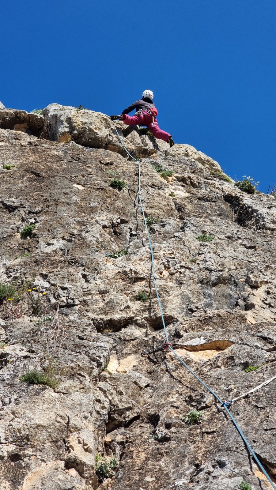 I did the rightmost route in the guide: Desbloques, 6a+ and recommended, and the route to its right, probably a similar grade – easy at first with a tough last few metres to the chain.