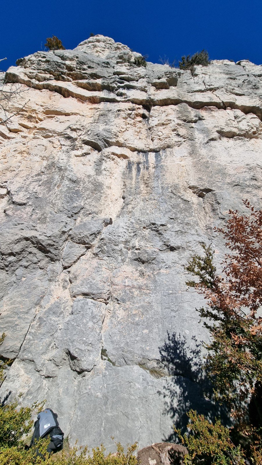 Each “Tablet” has a dozen routes up to 50m. The left is the easier of the two, with routes from V+ to 6c, while the right one spans 6c+ to 7b+. Filosofia Perrene, 6a, is a memorable and slightly harrowing outing up the full height of the wall. You get 14 bolts but that means they’re over 10ft apart on average, and the climbing is very sustained.