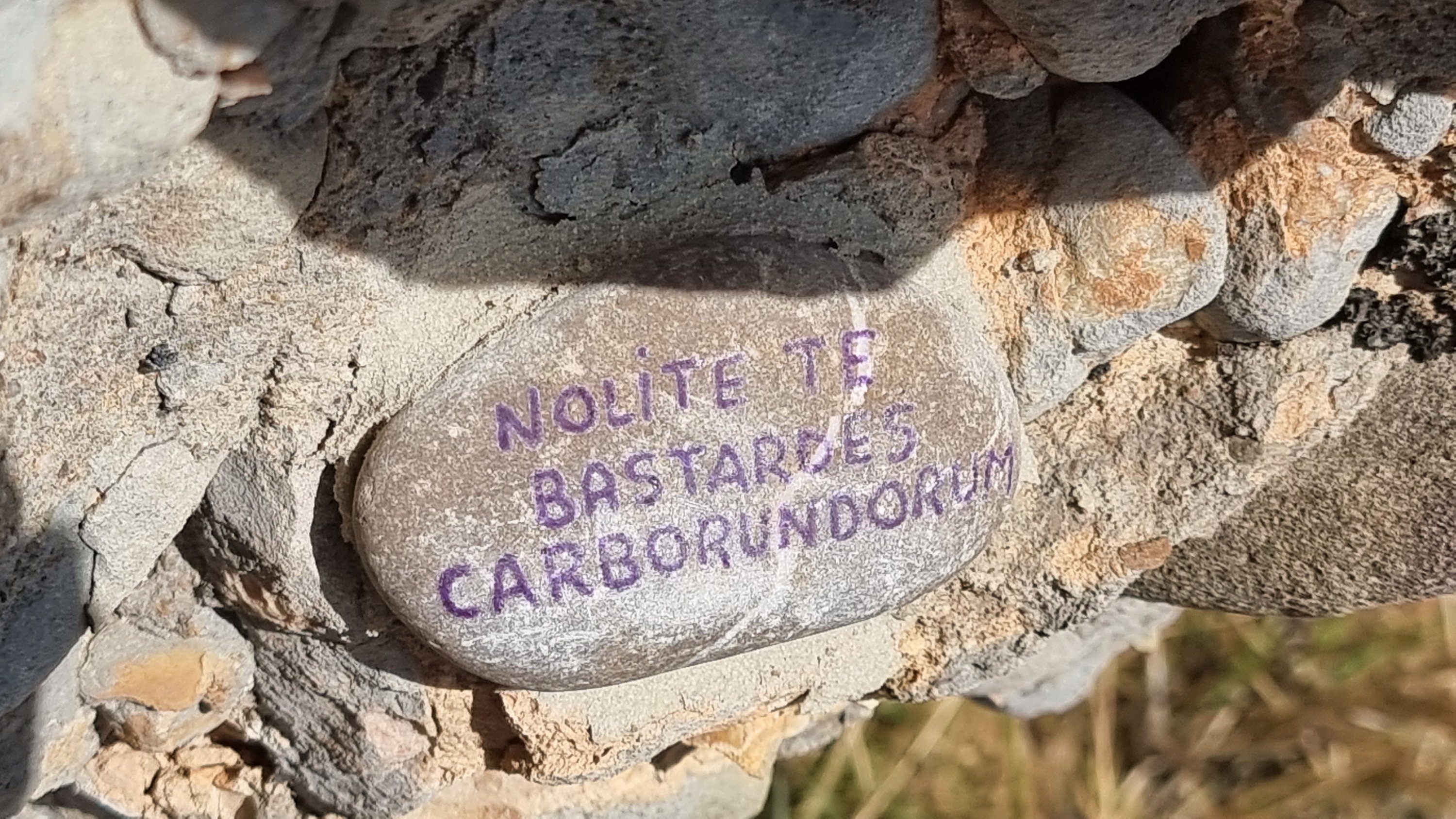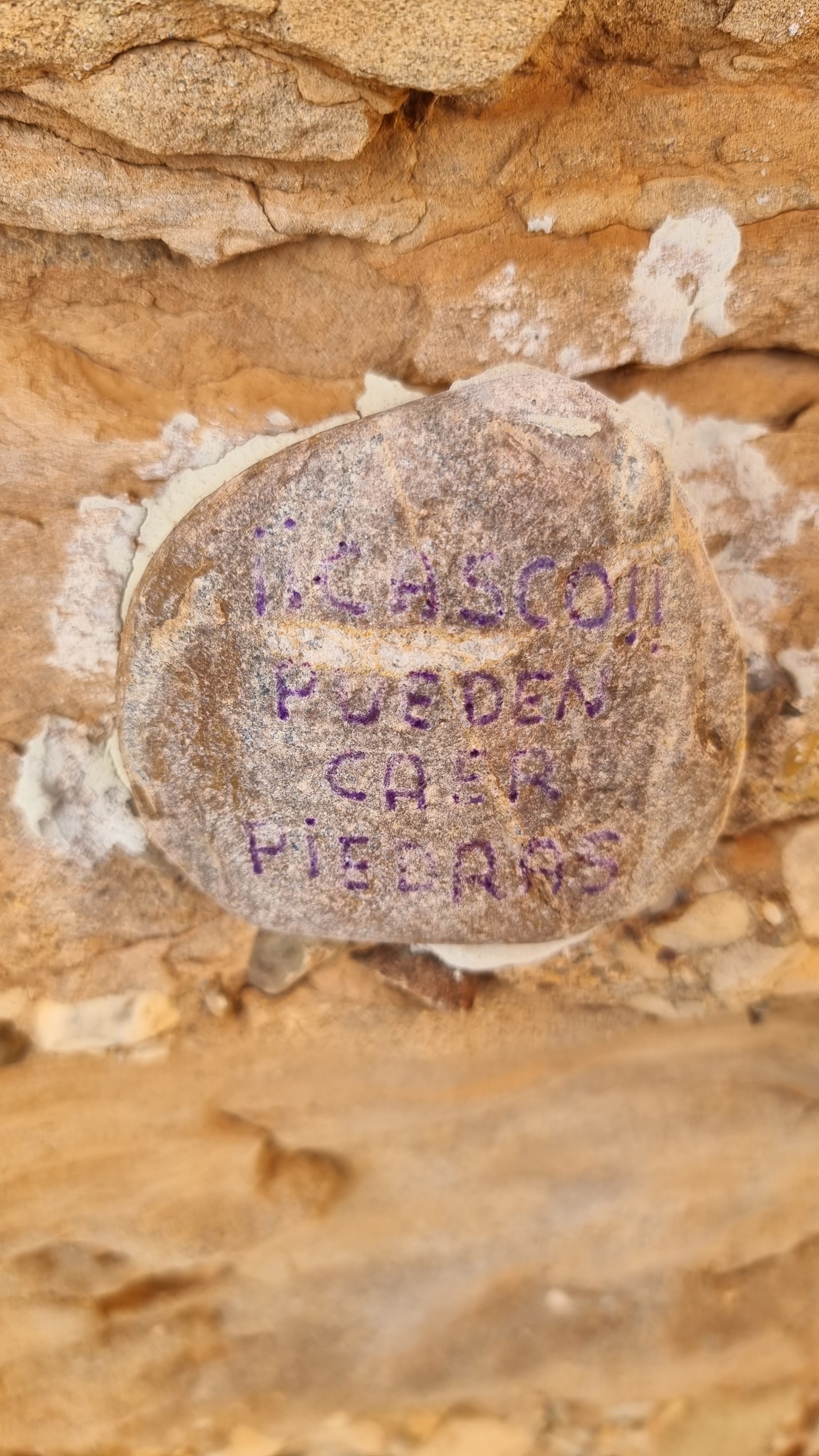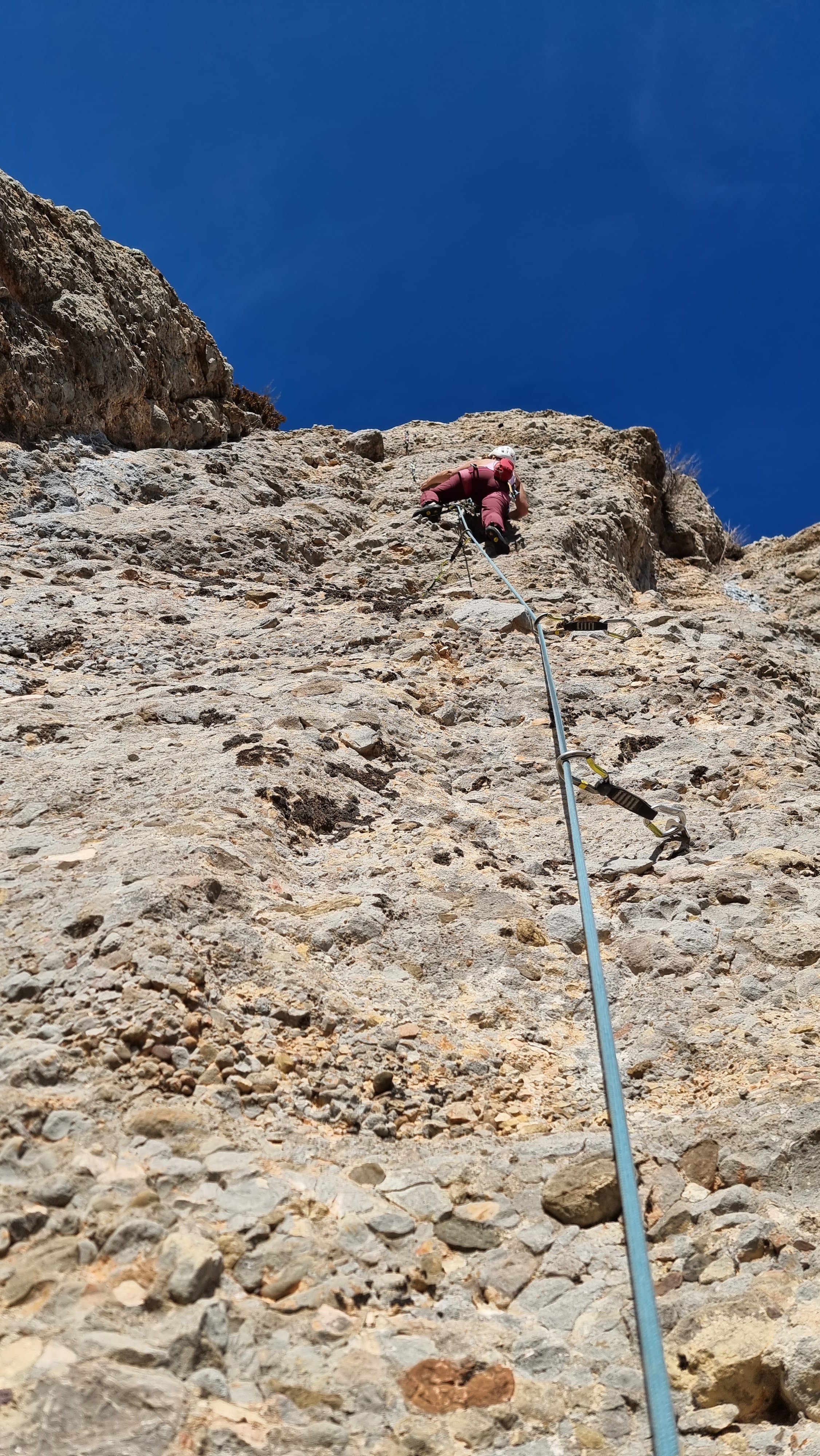 Down at the lower level, in the centre of the crag, there are a few routes which run the full height of the crag (either in two separate pitches or in a 35m oner). I did Tetiaroa, 6b+ if you do it in one pitch. The name plate didn’t quite match the route but the line was obvious from the topo. Much to my dismay I sent a fist-sized lump of rock down onto Helen as a crumbling foothold sent me flying. Despite much care, I managed to send down a couple of further salvos (luckily near misses) before topping out. Lowering off I took a closer look at the painted route marker, which in hindsight was more obvious: “Il CASCO! PUEDEN CAER PIEDRAS” or “Helmet! Rocks can fall down”.